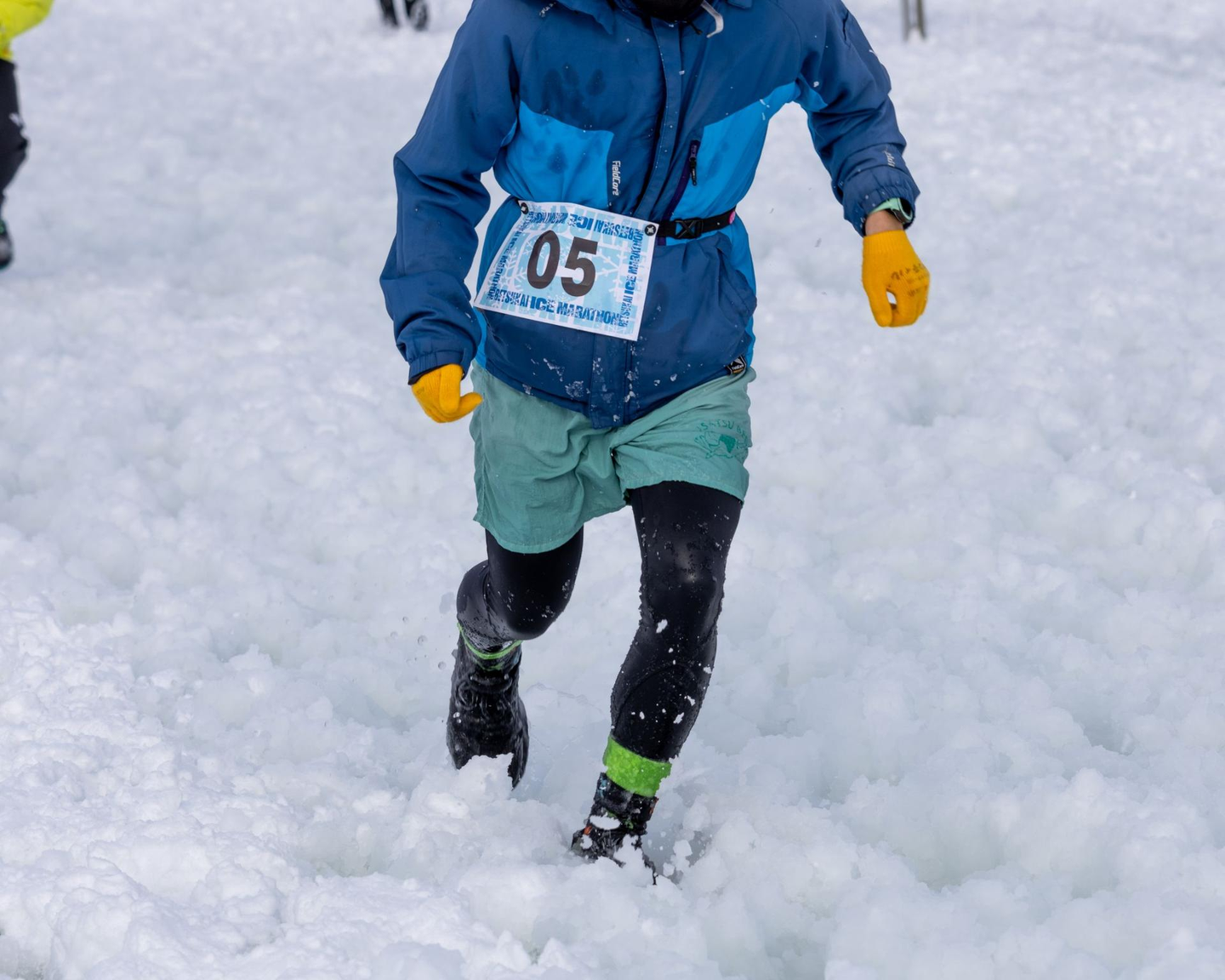 当日は、気温が高い影響で一部氷や雪が解けており非常に足元が悪く、田んぼを走っているような感覚でした。(一番下の氷はしっかりしているので、落水することはありません)