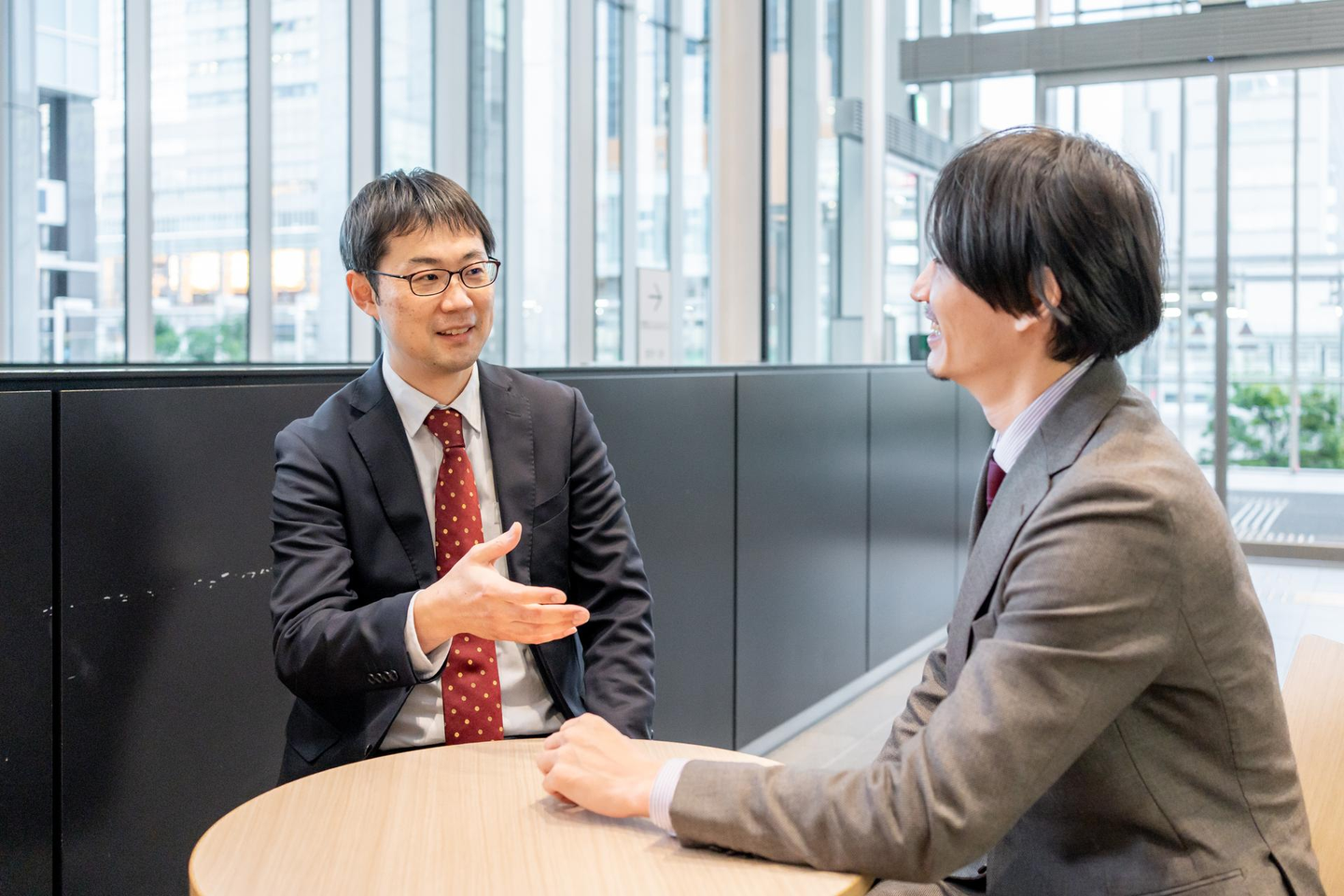 社内だけではなく、気分転換に2階カフェエリアで打ち合わせをすることもあります。