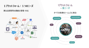 Odooは、全世界で700万以上のユーザーを持つクラウドベースのERPシステムであり、販売、在庫、会計、プロジェクト管理、製造など幅広いビジネス機能を一つのプラットフォーム上で提供します。あらゆる規模の企業が個別カストマイズによるコスト増を極力抑えつつ、迅速な意思決定に必要な統合型ERPを活用することが可能です。