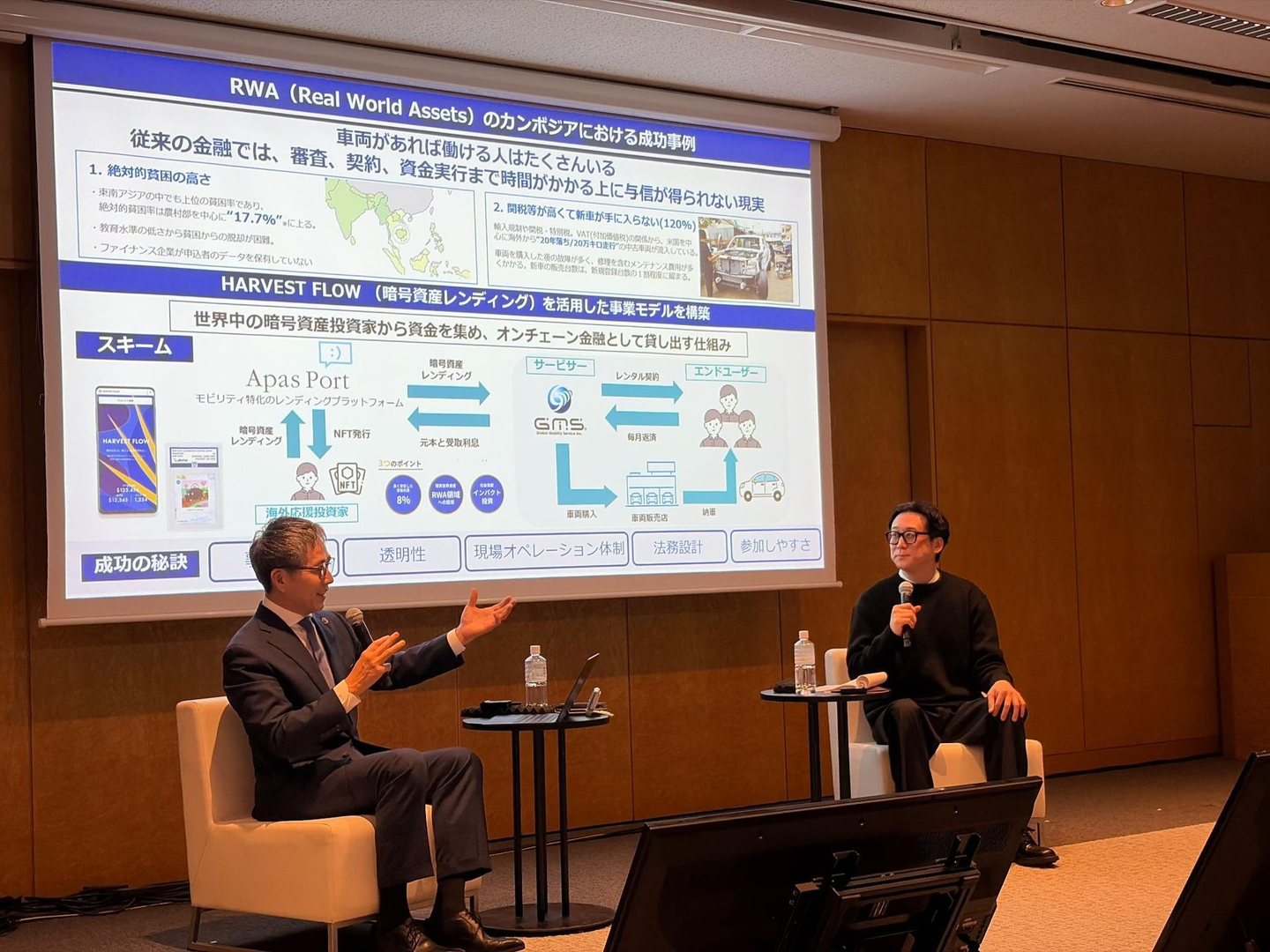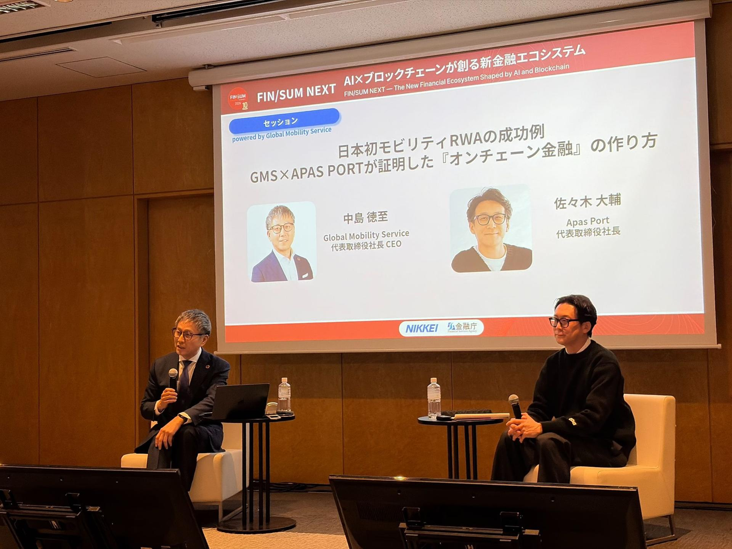 ワークショップでは、「日本初モビリティRWAの成功例 GMS × Apas Portが証明した『オンチェーン金融』の作り方」をテーマに、Apas Port株式会社 代表取締役社長の佐々木大輔様をお迎えし、中島と対談形式でセッションを実施しました。