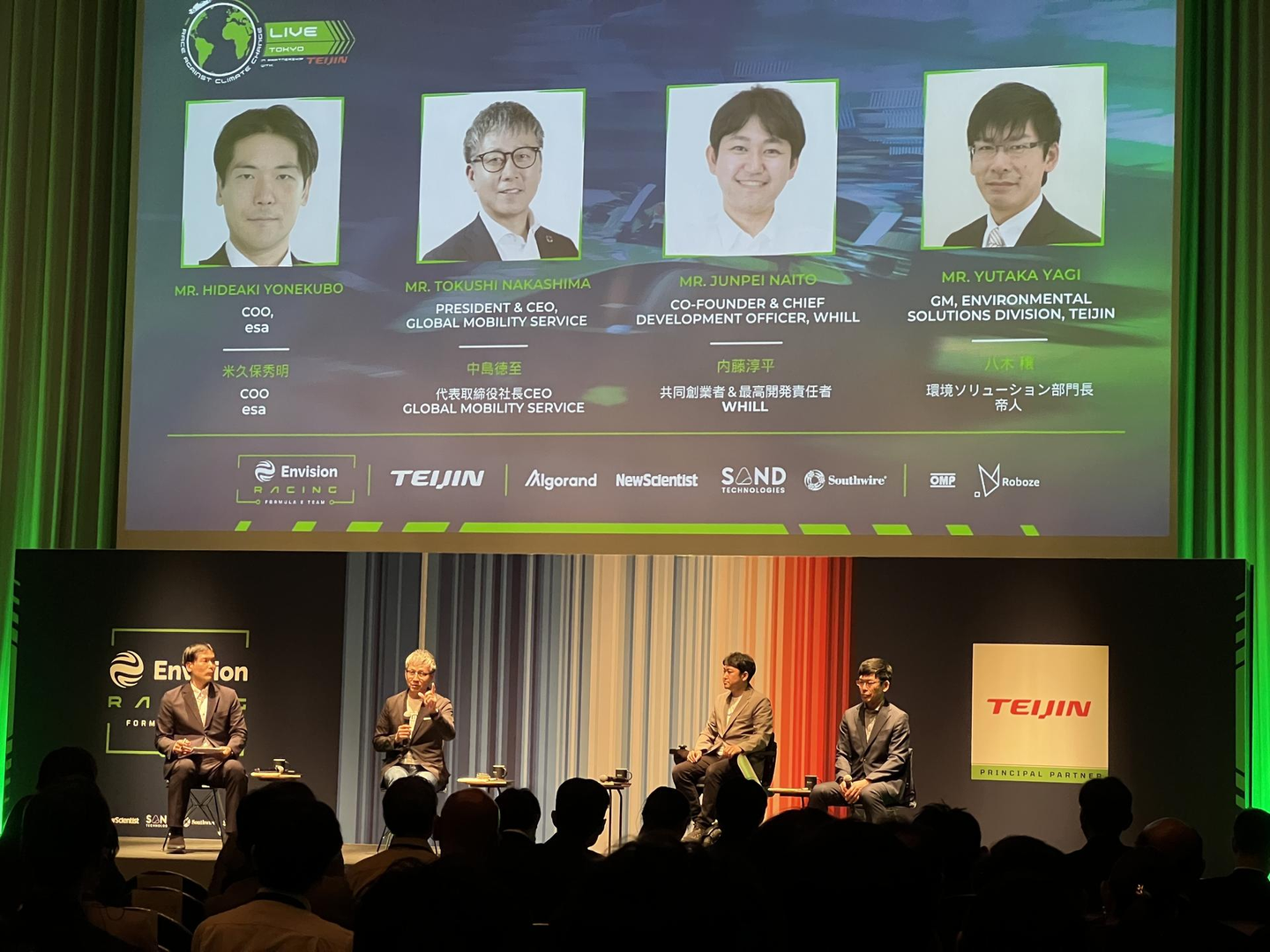 (左からesa COOの米久保秀明氏、GMS代表取締役社長CEOの中島徳至、WHILL共同創業者&最高開発責任者の内藤淳平氏、帝人環境ソリューション部門長の八木穣氏)