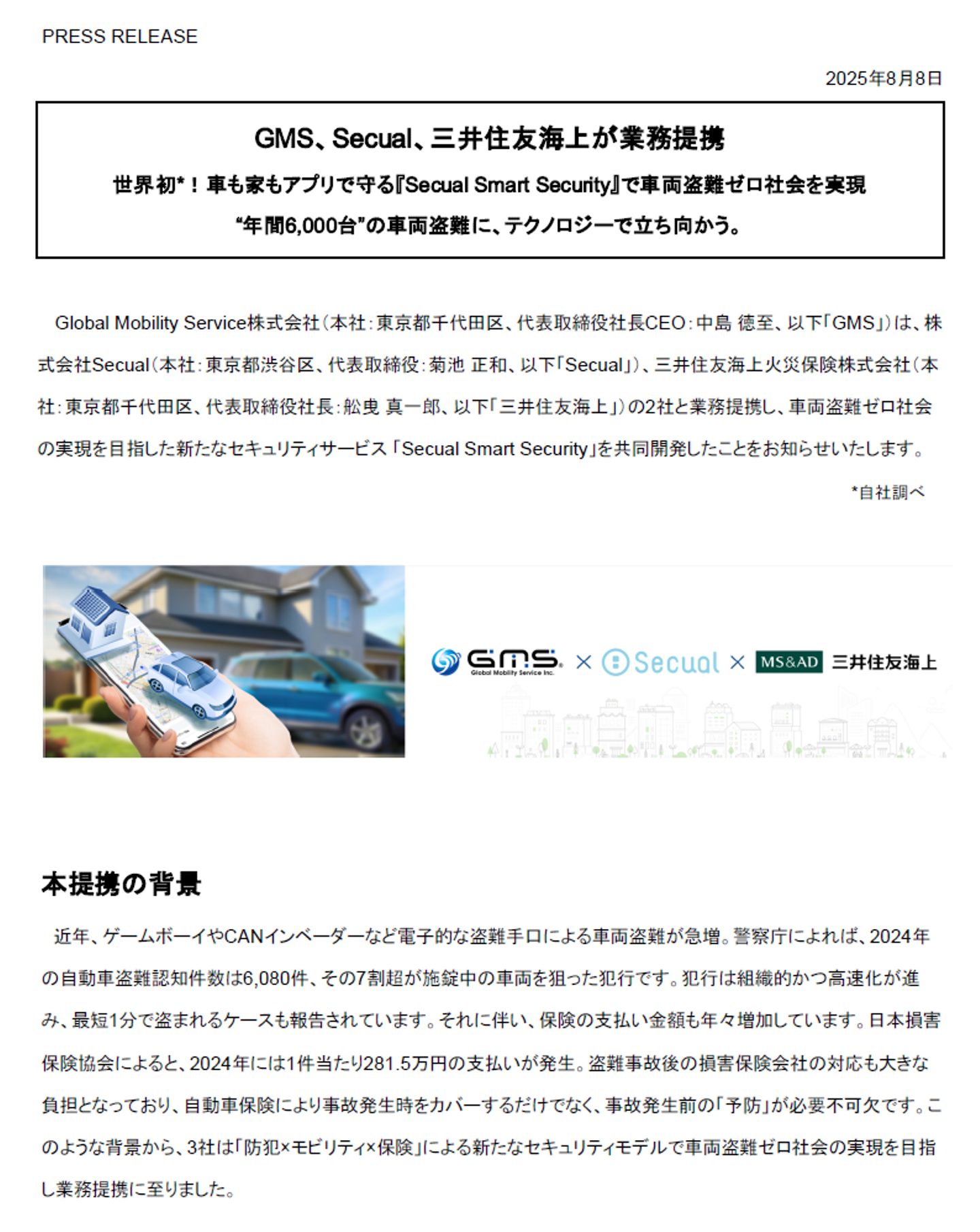 GMS、Secual、三井住友海上が業務提携 ~世界初!車も家もアプリで守る『Secual Smart Security』で車両盗難ゼロ社会を実現~