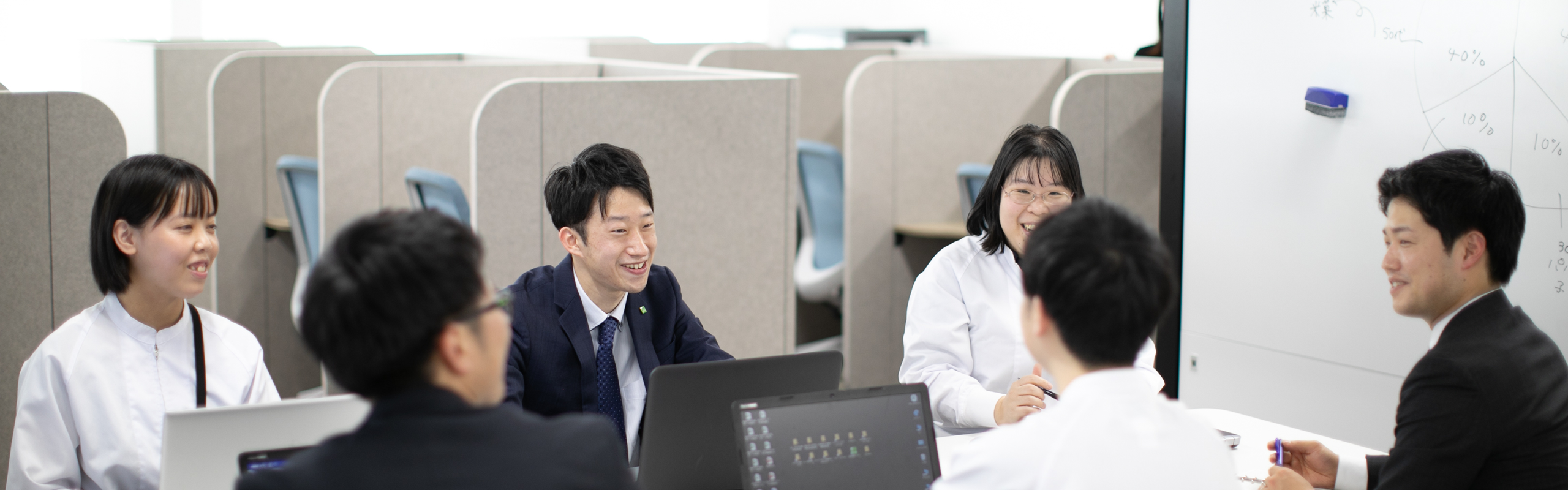 タケショーは全国的にも珍しい業態だと言われます。それは、卸(問屋)でありながら、開発、製造機能を持っているから。そして、「食品開発 支援事業」、「健康・栄養充足 支援事業」「分析・研究 支援事業」の3つの事業が互いに関わり合いながら、シナジー効果を発揮し、お客様にお届けする最高の「食の花束」を創り、お届けしています。また、ワンフロアオフィスでは、他部門のメンバーとの会話がきっかけとなり、部門間のコラボレーションに発展することもあります。