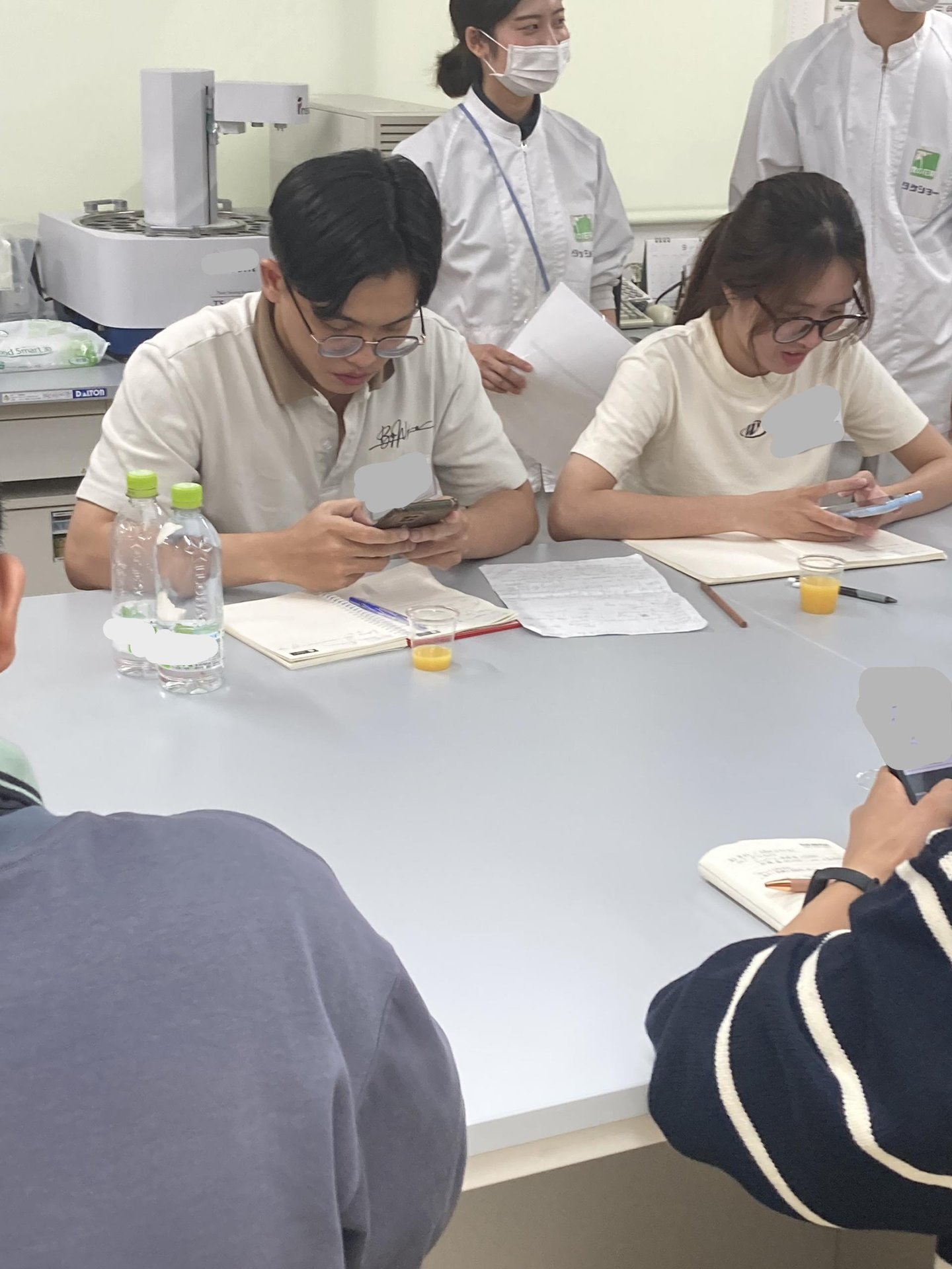 その後、研究開発部の仕事について紹介の後、五味試験を体験していただきました。中濃度、低濃度の塩味、甘味、酸味、旨味、苦味を判別するのは非常に難しかったようです。また、4種類のオレンジジュースを使った官能評価体験は、日本人とベトナム人の味の感じ方の違いを知る良い機会となりました。