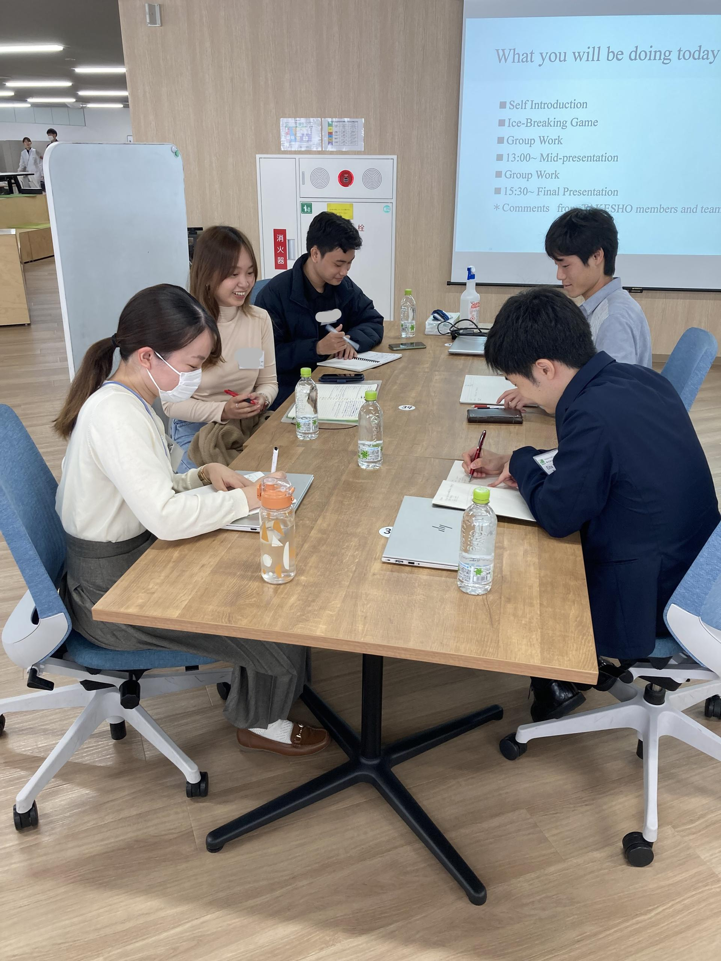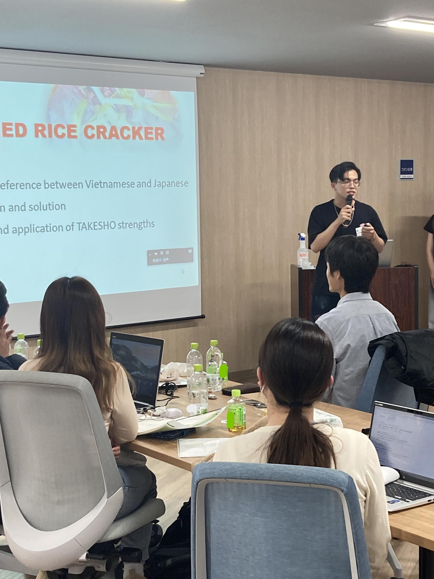 日本の米菓やどら焼き、お汁粉などを食べながら、日本とベトナムの嗜好品について意見交換をした後、テーマに沿って両チーム熱い議論が交わされました。英語でのコミュニケーションに苦戦する場面もありましたが、日本とベトナムの学生とタケショー社員が輪になって一つのテーマに取り組むシーンには、これからのタケショーを象徴するものを感じました。