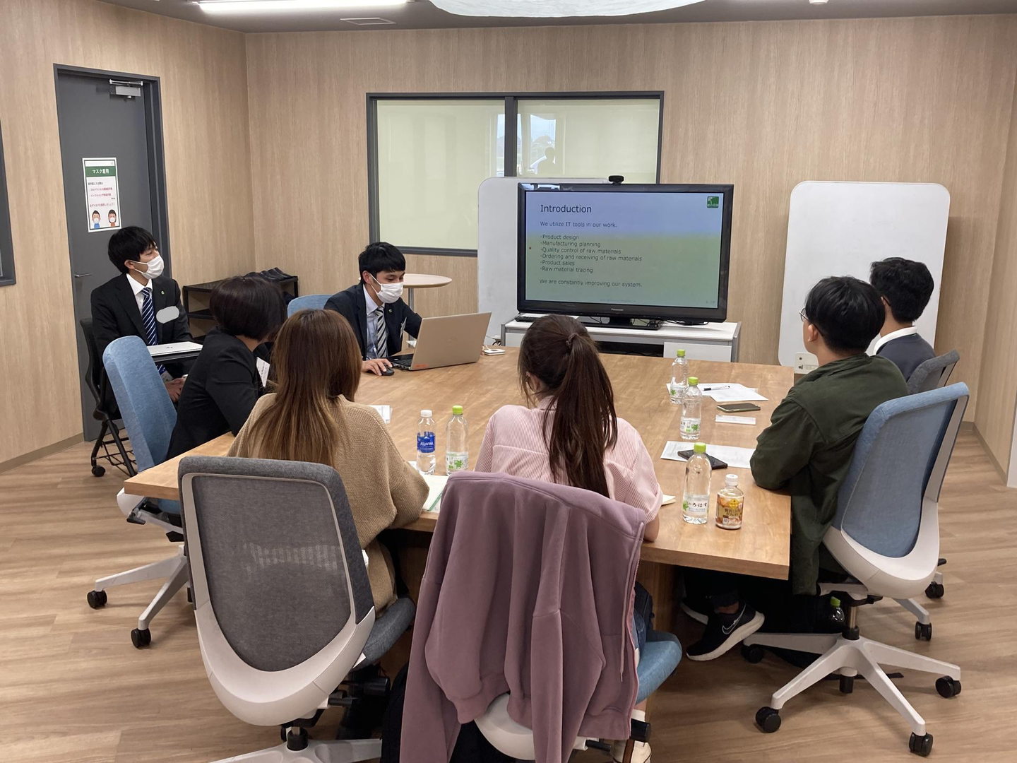 まずは、製造部の仕事について紹介の後、実際に製造室を見学していただきました。本プログラムに参加したCTUの学生は、事前にタケショーフードベトナムの製造室も見学いただいていますので、日本とベトナムの製造設備の違いを熱心に見学くださいました。また、アレルゲンなどの原材料管理や安全性についての質問もでました。