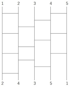 交換ありが5回なので、あみだくじで横線が5本あれば、24351は12345に並べ替えられることになります。