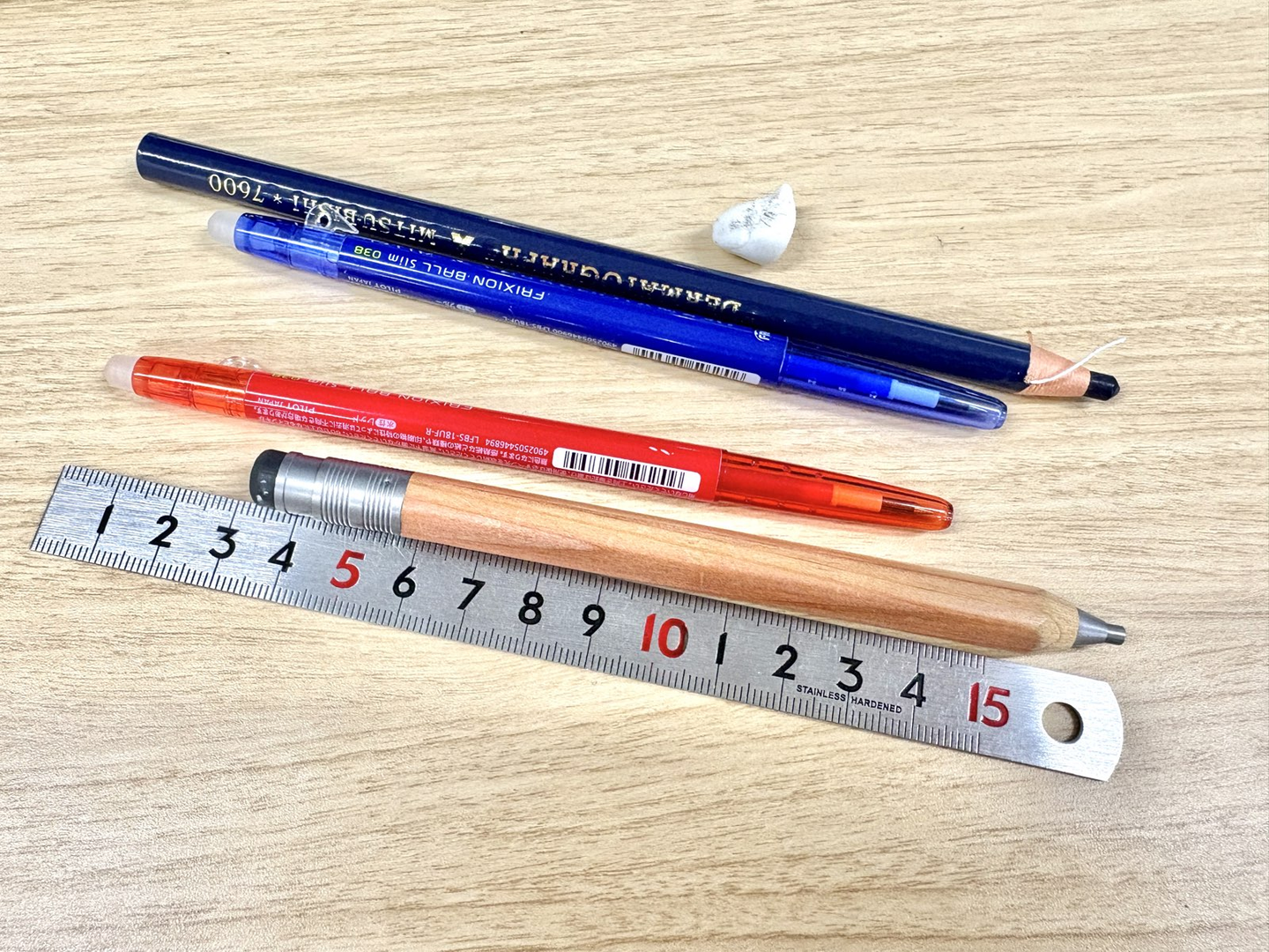 私の仕事道具は、えんぴつみたいな芯のシャーペン・赤ペン・青ペン・ダーマトグラフ・定規です。