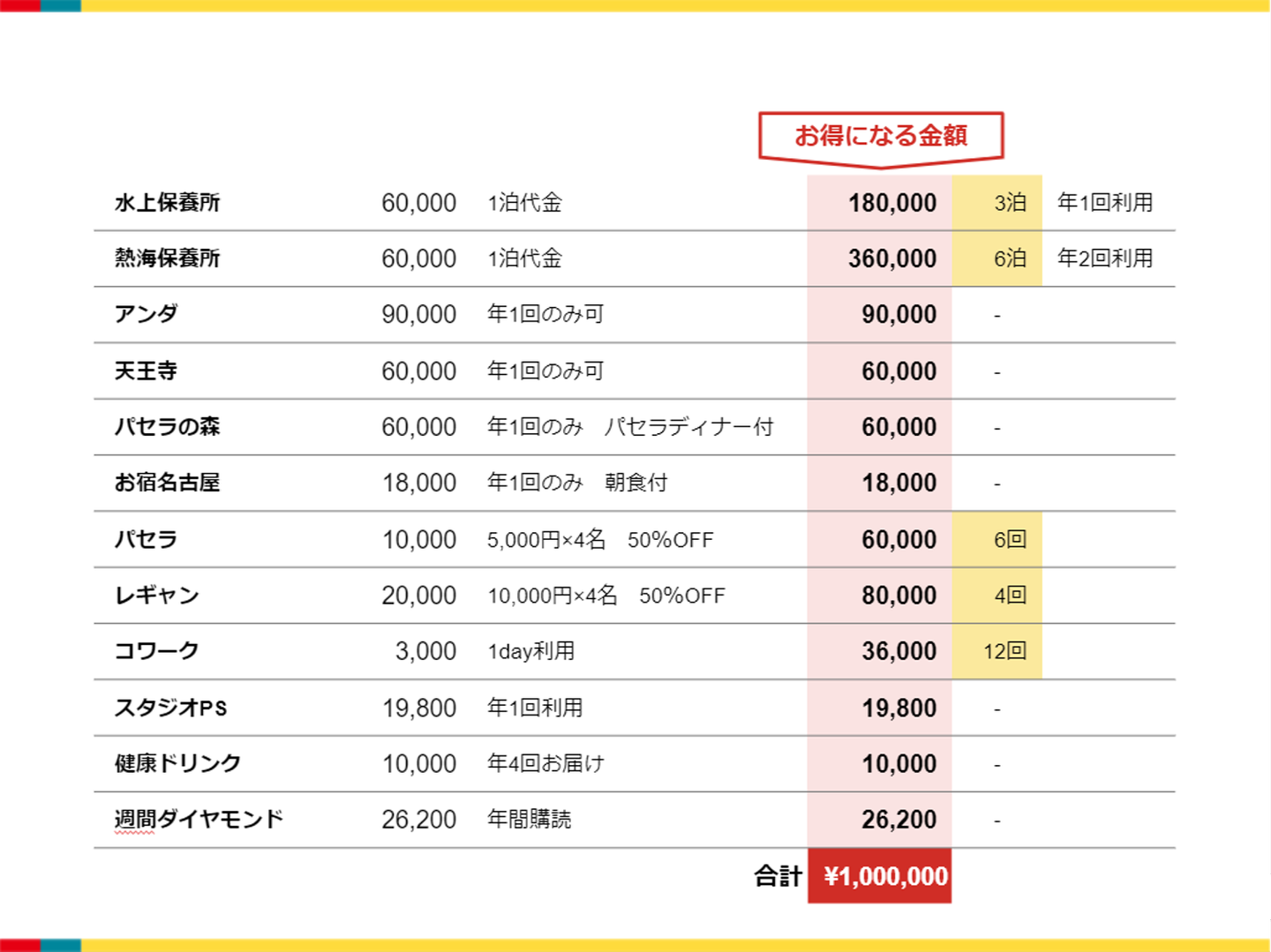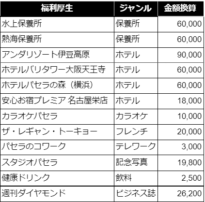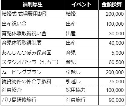次にそれぞれの福利厚生の金額換算を一覧表にまとめていきます。