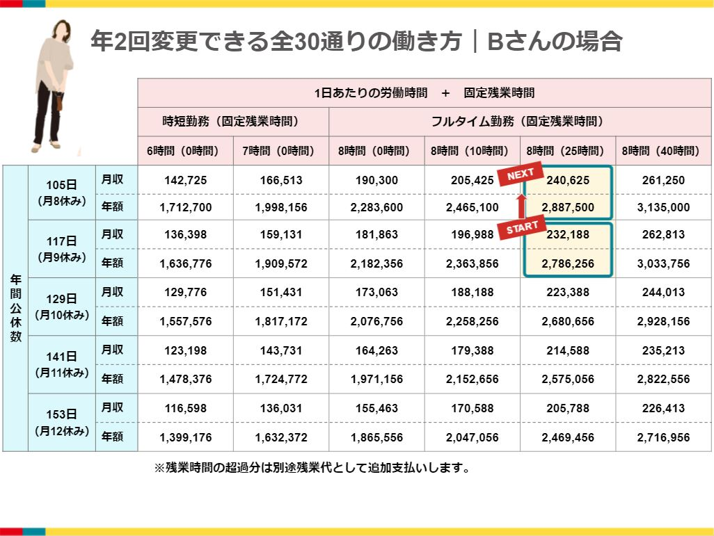 ・子どもを妊娠後、ワークライフバランス重視の働き方(年間休日129日、固定残業0時間、8時間勤務)に変更。