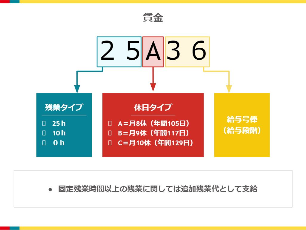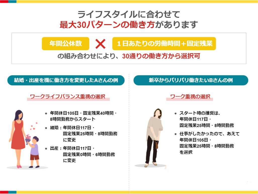 入社時にはこのうち「残業タイプ」と「休日タイプ」を自由に変更可能。ライフスタイルに合わせて自分らしく仕事に取り組めます。