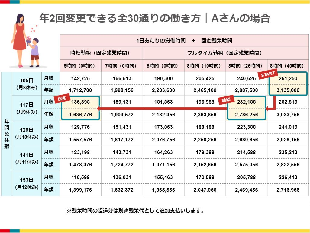 社内には結婚や出産を機に固定残業時間をゼロにしたり、休日数増やしたりして、ワークライフバランスをとる社員が少なくありません。Aさんも、だんだんと働きやすさ重視のスタイルにシフトしています。