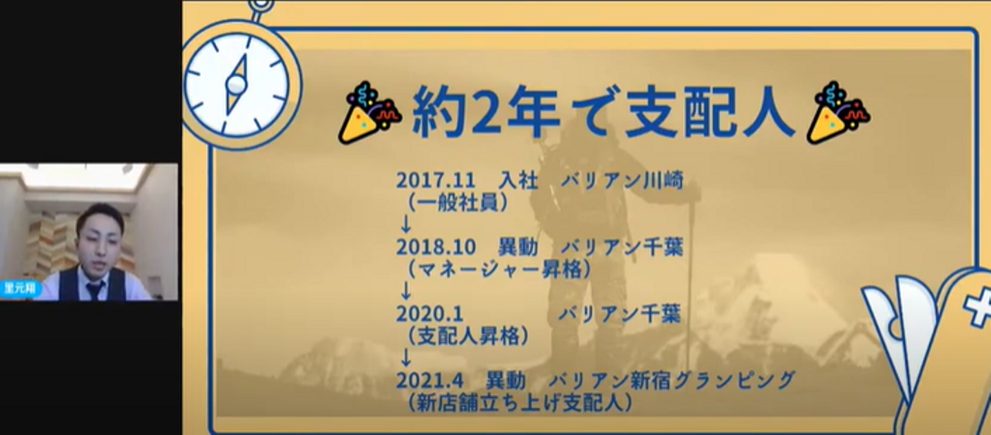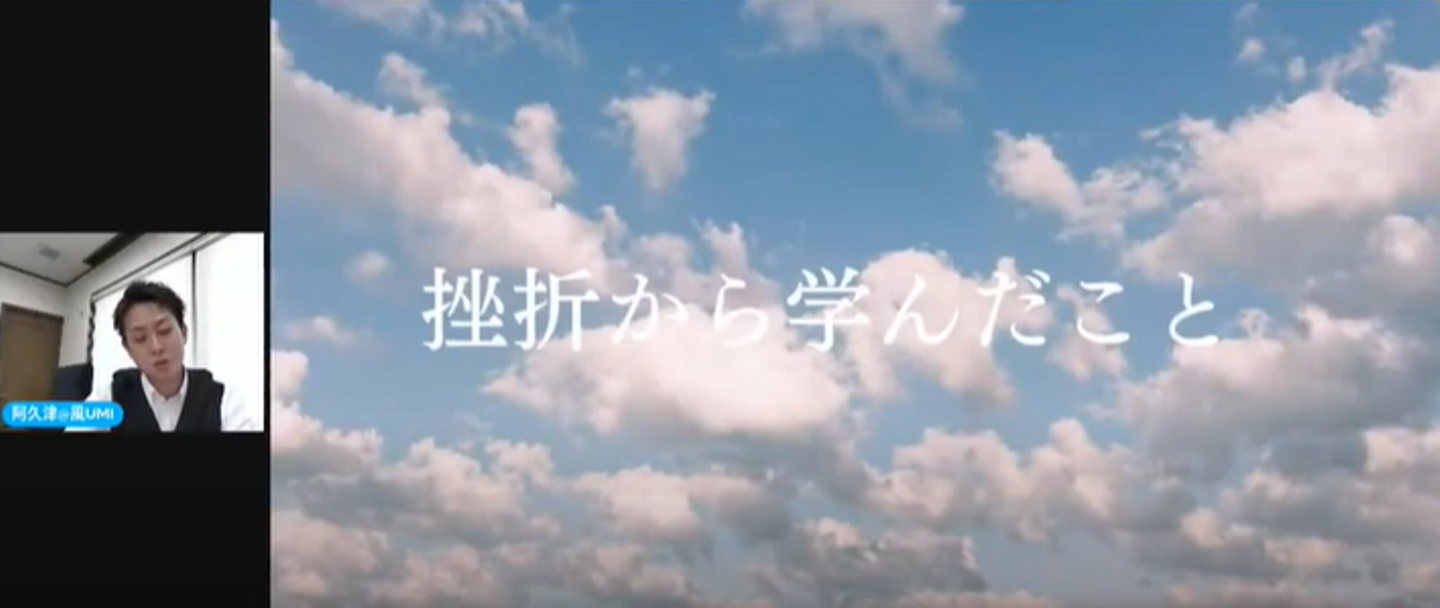 オンライン社内会議で発表する阿久津さん。テーマは「昇格~挫折から成長~」。