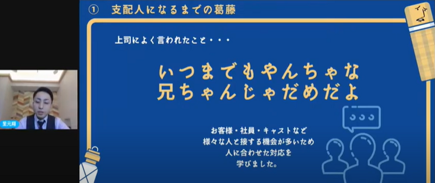 上司から言われたこの言葉の意味を、最初はピンと来なかったそうです。しかし、お客様・社員・キャストなど、様々な人と接する中で、人に合わせた対応が必要だと学びました。例えば、仲良いコミュニケーションのつもりで、特定のキャストに対して、呼び捨てやちゃん付けで呼ぶことがあったそうです。
