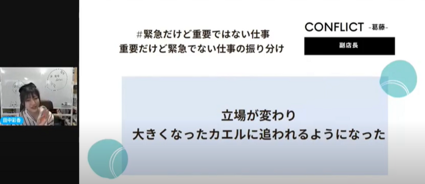 元気いっぱいの笑顔で発表してくれた田中さんのテーマは「高卒からの副店長エピソード」。