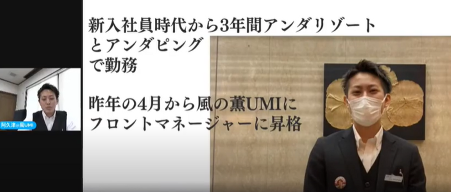 まず紹介するのは、現在、ホテル「風の薫UMI」でフロントマネージャーを務める阿久津幹人さん。大学時代に飲食店のアルバイトで接客の楽しさを知り、2018年にNSグループに新卒入社。入社後はホテル配属となり、お客様アンケートで2度表彰されたこともあります。