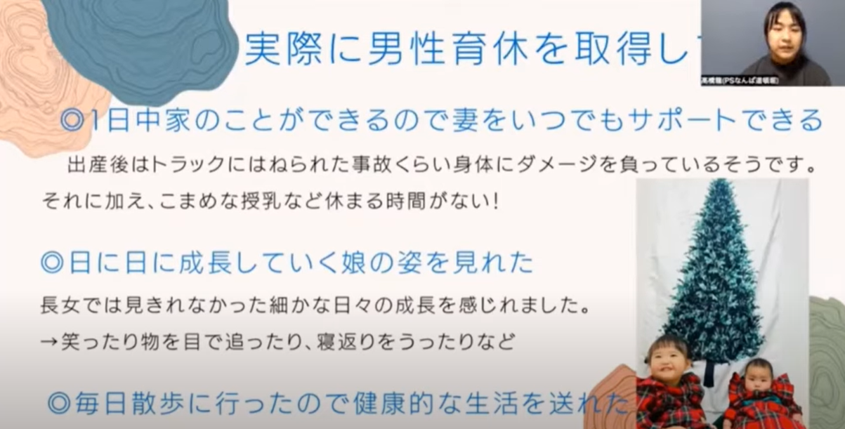 「ふたりの間に生まれた子どもは、ふたりで育てて当然」と、髙橋さんは言います。そして、改めて男性育休取得の素晴らしさを語り、他の社員にも取得を促しました。