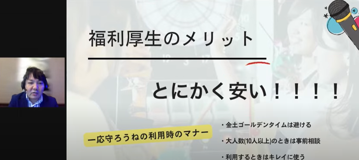 福利厚生で利用する場合、金・土・ゴールデンタイムは避けることや10名以上の場合は事前予約をすること、利用する際はキレイに使うことといったマナーはお忘れなく。
