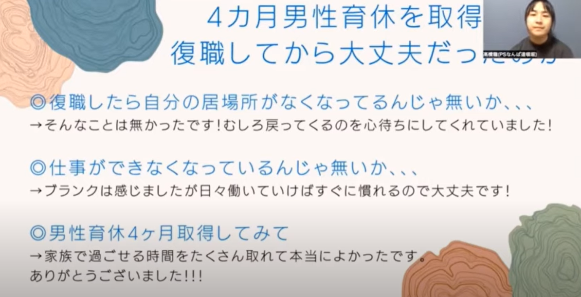 そして、実際に男性育休を取得し、出産後の大変な時期に妻をサポートできたこと・お子さんの成長を見守れたことが、本当に良かったと振り返りました。
