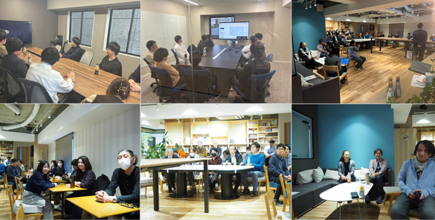 メンバーがゆったりと落ち着いた環境で話を聞くことができるよう、アクロポリス(カフェスペース)と会議室へ分散。今回は初の試みだったため、冒頭、Web配信で小さな不具合の発生もありましたが、そのあとはスムーズに進行しました。今回の開催・運営はとても良い経験になり、今後は大きな会議・イベントを含め、オフィスをより幅広く活用していけそうです!