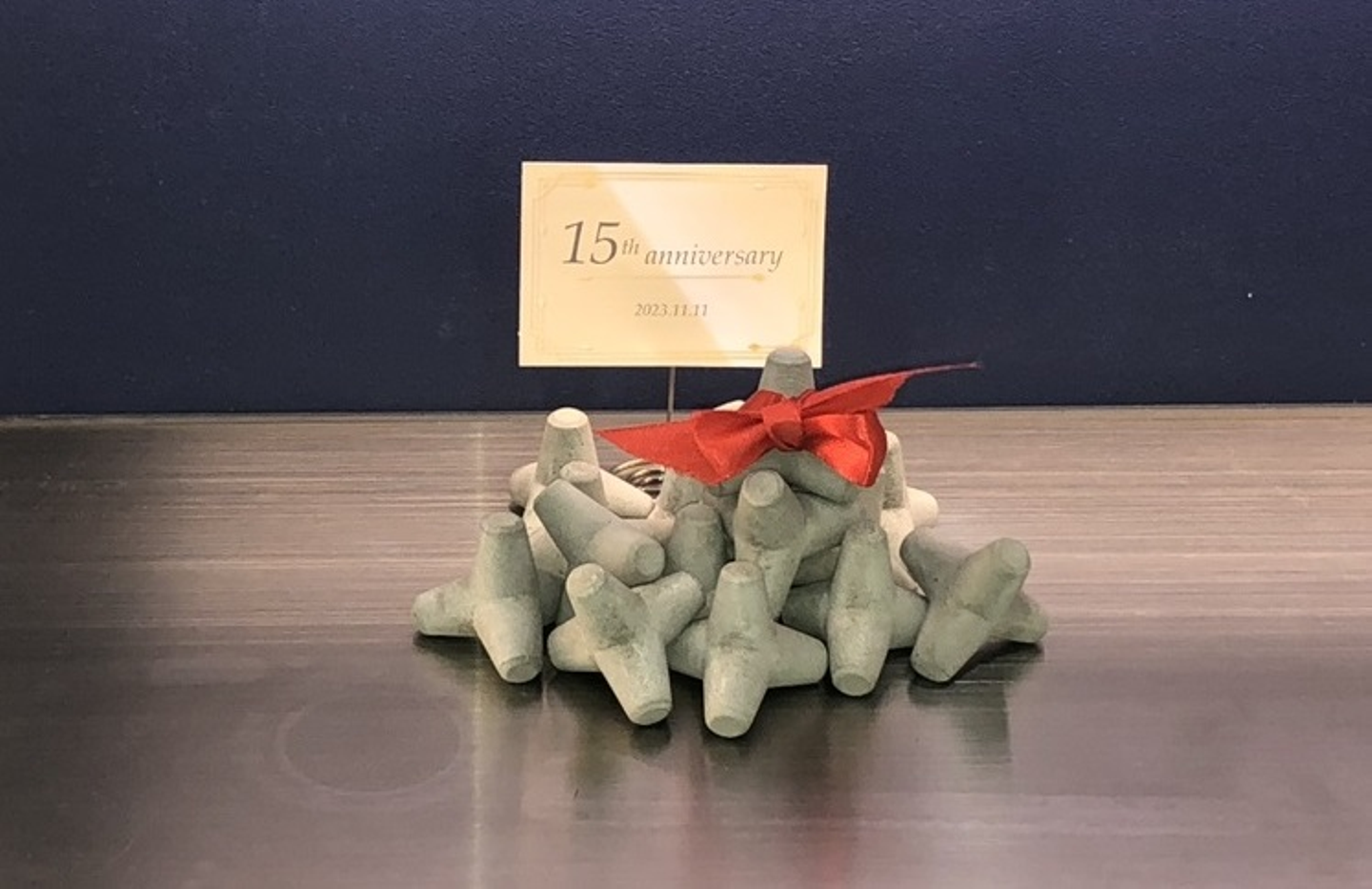 毎年、創立記念日に『テトラ・コミュニケーションズ』にちなんだミニチュアのテトラポッドを