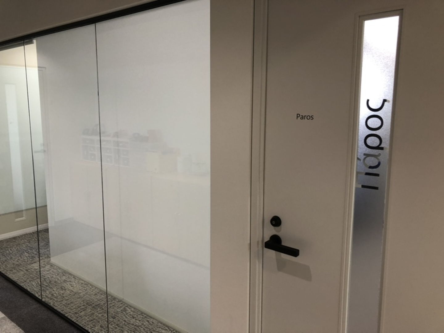 テトラではすべての部屋に「ギリシャの島」の名前をつけています。こちらは社内公募と投票で決定しました。ドアの小さい文字は英語、ドアガラス部分の切り文字はギリシャ語の表記にしています。