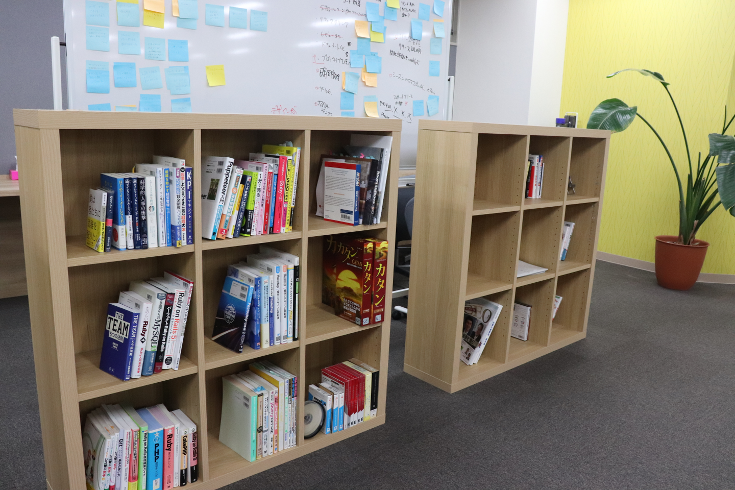 △画像:本棚には、スキルアップのために会社で購入された本がいっぱい