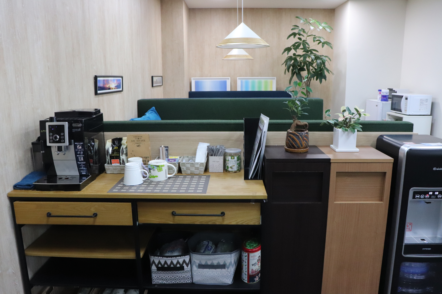 ウォーターサーバーやコーヒーメーカー、紅茶などのティーバックが揃っています。