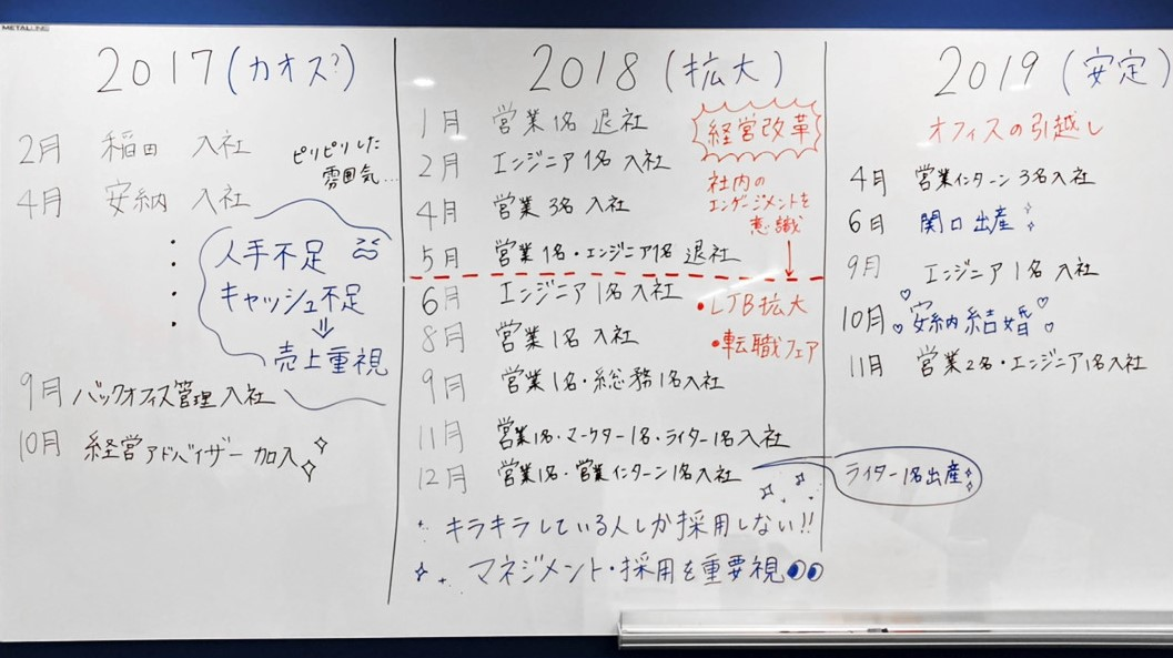 安納さん)年表を見てもわかると思うけど、この年はかなり採用に力を入れていたね。2017年より前は、とりあえず営業で即戦力になる人ばかり採用していたけど、2018年はエンジニアやバックオフィス、マーケターなど「会社を支える人材」を重点的に採用したかな。