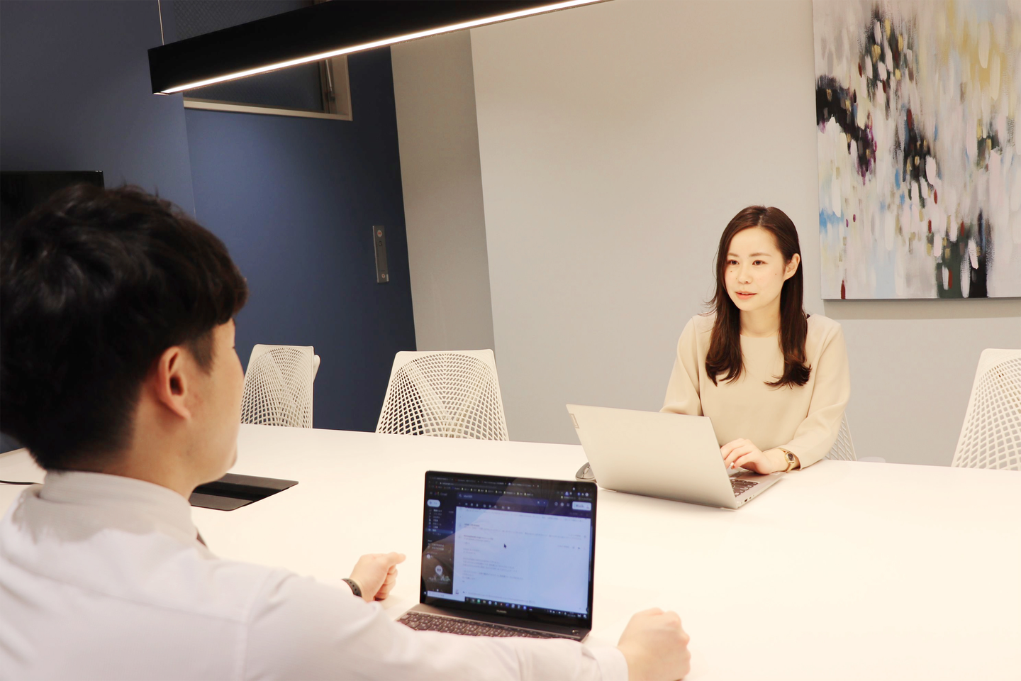 chatworkでのやりとりが盛んなので、社内にいる方だけでなく、リモートで出社していない方にも気軽に質問できました。