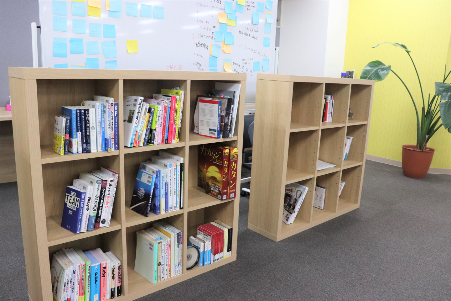 本棚には、『転職とは』とか『知財とは』とか、、仕事に関わる本がたくさん揃っています。