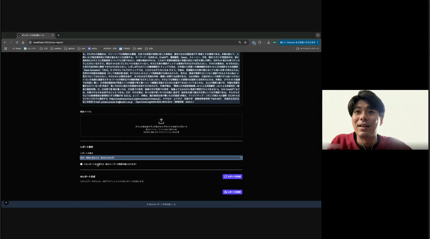 - AIレポート作成支援ツール: ビジネスデータを入力すると、AIが分析しレポートを作成。Supabaseに保存され、一覧表示や編集が可能。