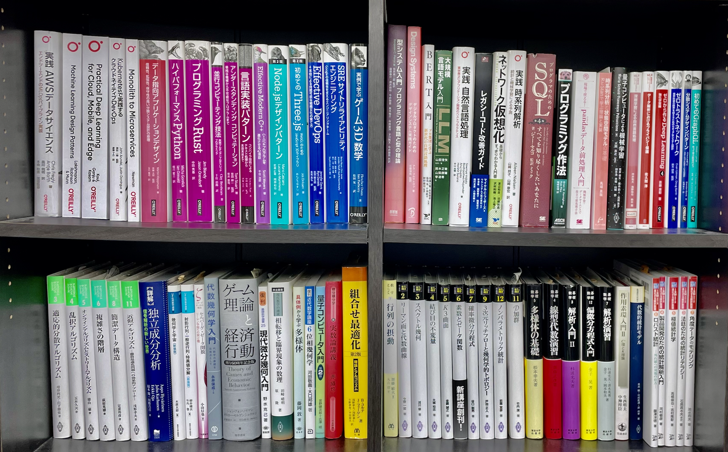 社内には500冊以上の技術書籍が揃えられている。基礎的なプログラミングに関する書籍から始まり、データ構造、アルゴリズム、ソフトウェア開発のベストプラクティス、さらには専門的な数学やデータサイエンスに関連する高度な内容まで、幅広い分野をカバーしている。