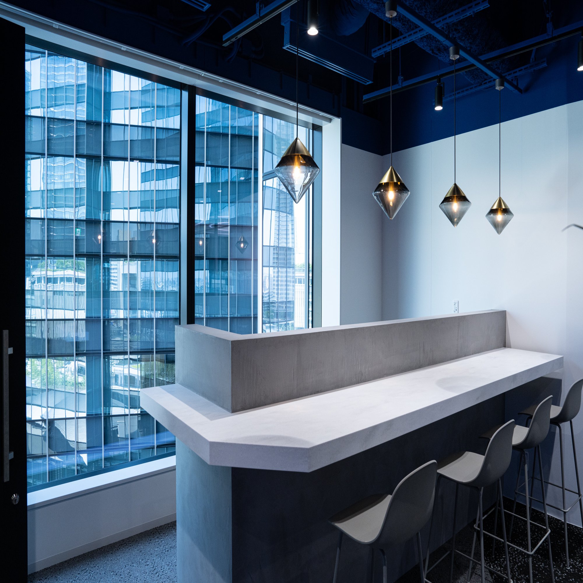 「この部屋での商談はすべて良いものになる」——代表の強い想いを体現した会議室。ロゴをかたどった特注テーブルが空間の象徴です。大人数での会議にも対応できる、こだわりの詰まった会議室です。