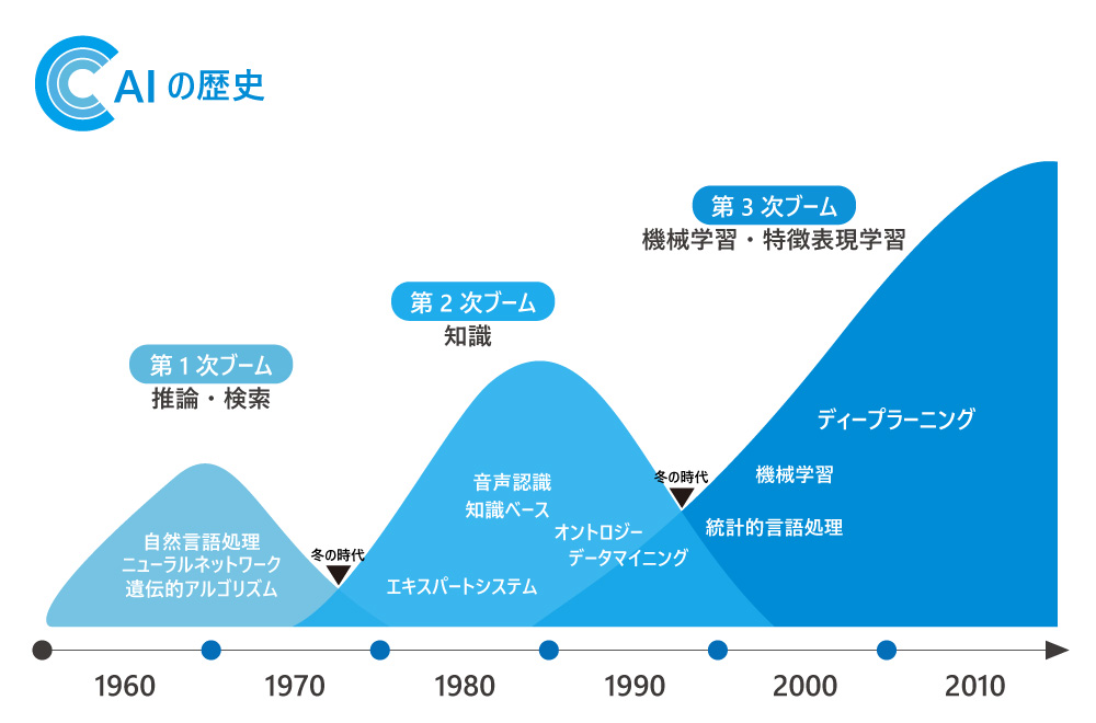 上記の課題を解決したのが、AIが自ら学習するといった機械学習の発想です。その中でも第三次ブームの火付け役がディープラーニングとなります。