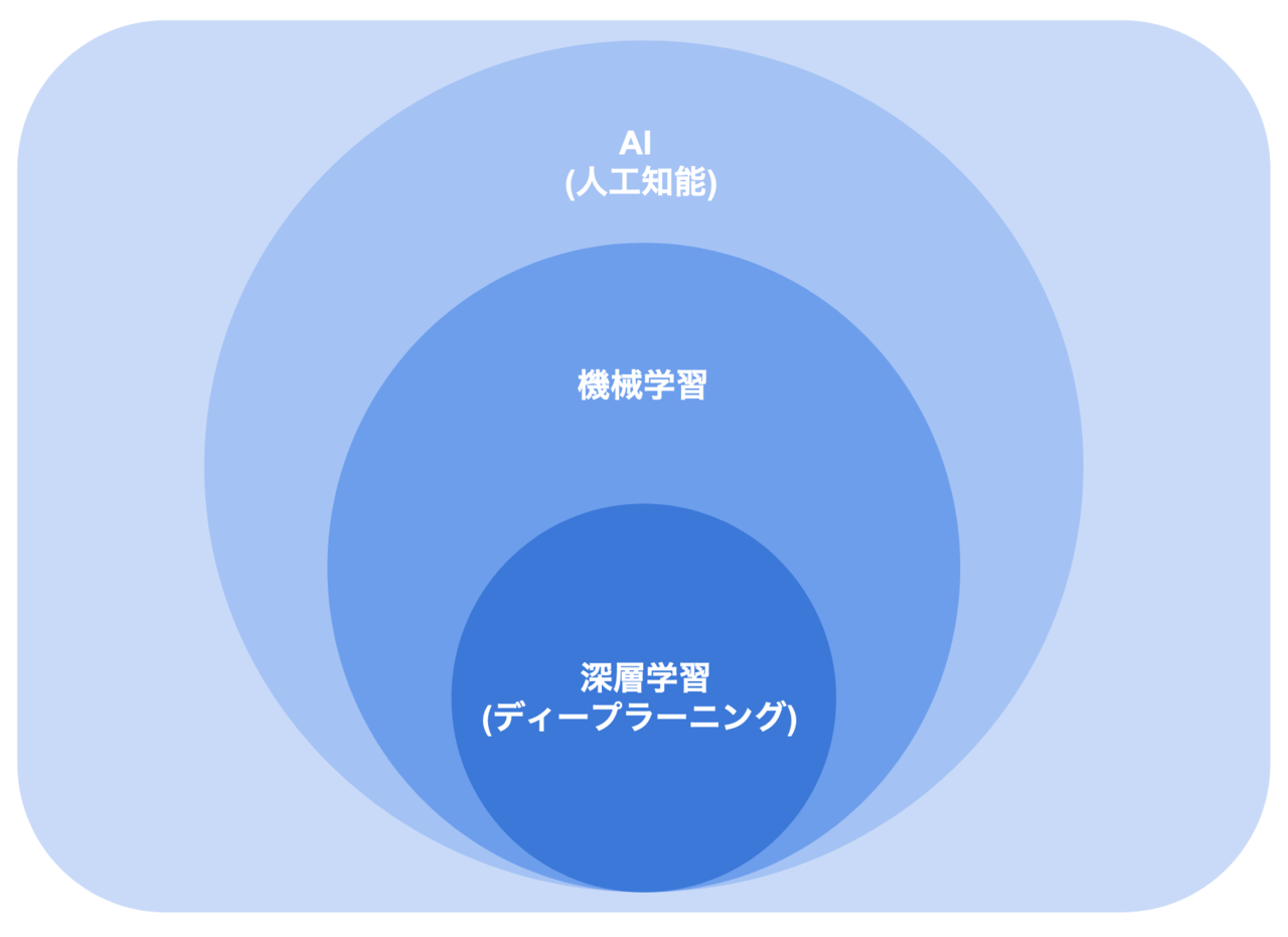 似たような意味合いを持つ言葉ですが、実は同じ分類なんです。 AIという大きな分類の1つに機械学習が含まれ、機械学習の分類の1つにディープラーニングが含まれるといった関係性になっています。