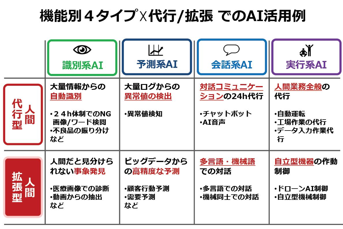 機能別では、「識別系」「予測系」「会話系」「実行系」に分けられます。
