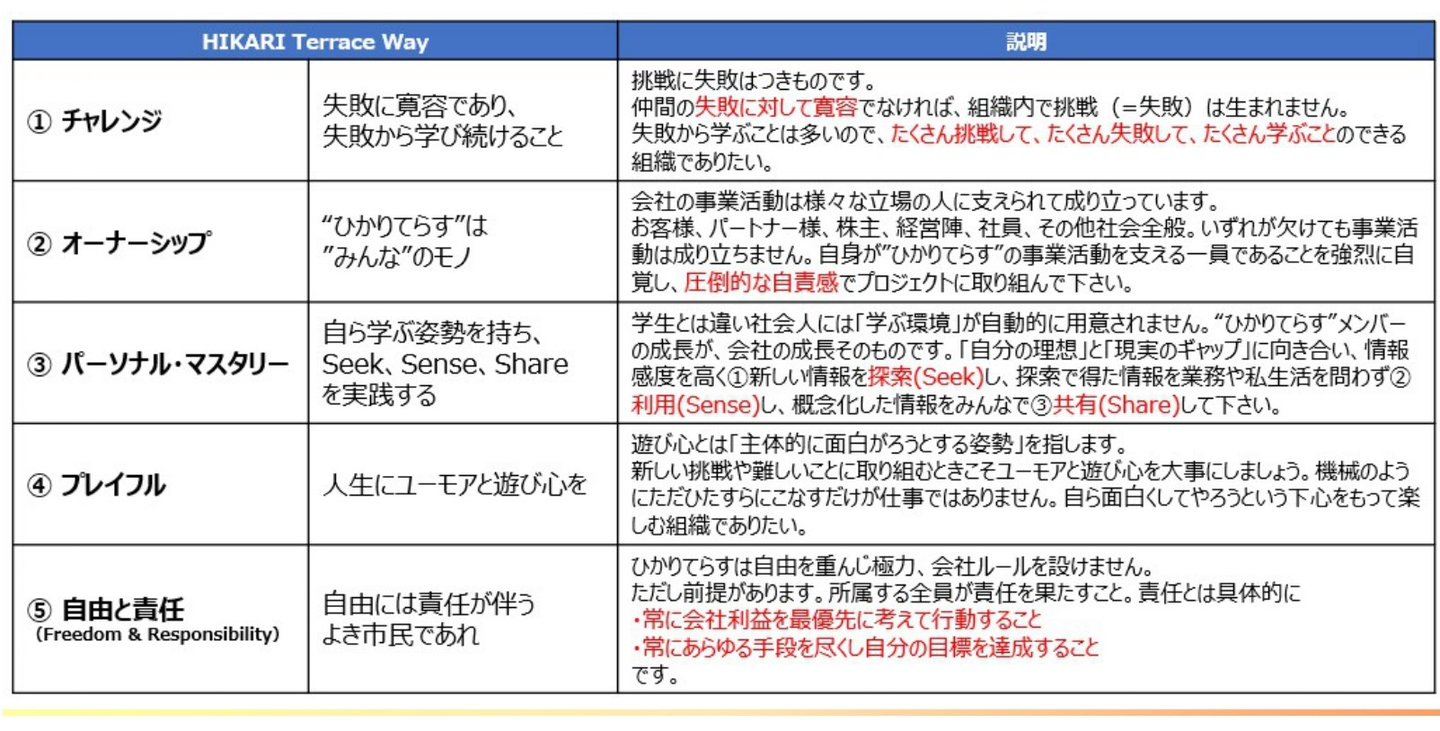 ひかりてらすに所属する人、全員に持っていてほしい価値観・行動規範であり採用基準でもあります。