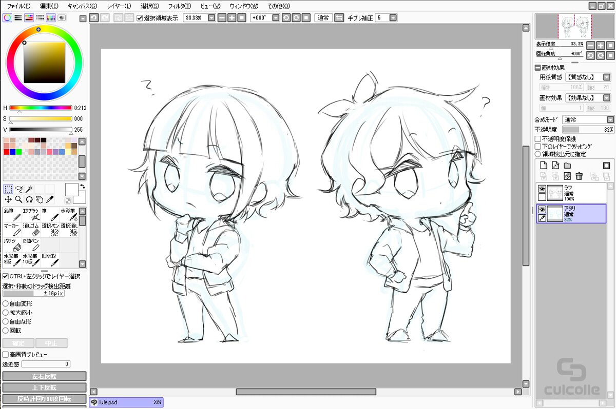 S「culcolleキャラクターのレコ・ルカの新しいSDバージョンを描いてほしいとのことだったので、そちらの過程を説明します。大まかな流れとしては①アタリ②ラフ③線画④着色⑤完成となりますので順に見ていきましょう」
