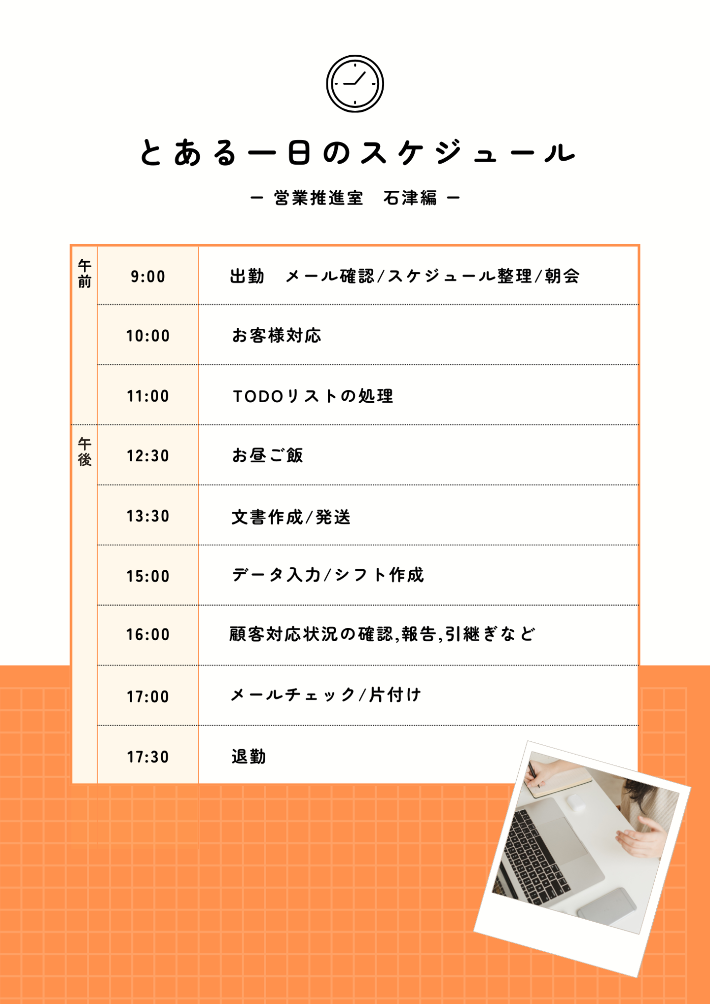 営業推進室の石津です。 今回は私の一日のスケジュールをご紹介します。