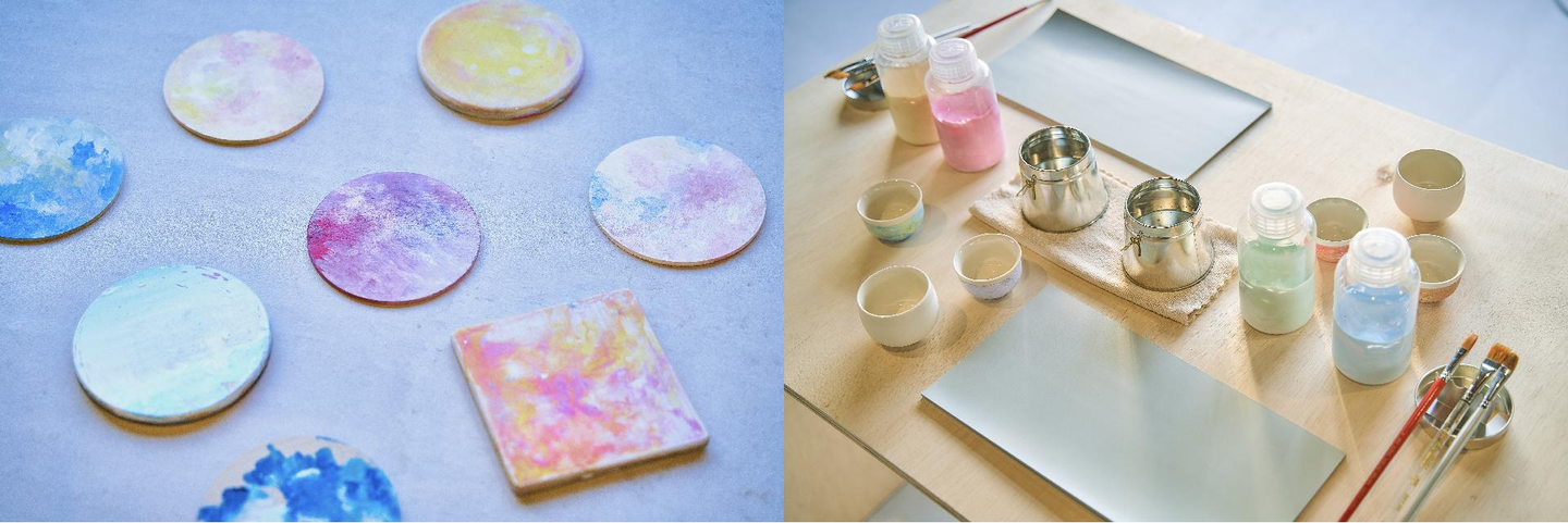 器を制作し、その日のうちにつくりたての器で日本茶を飲む、というスペシャルな体験を楽しんでいただくために、速乾性があり、かつ可愛くもカラフルな塗料を採用しています。
