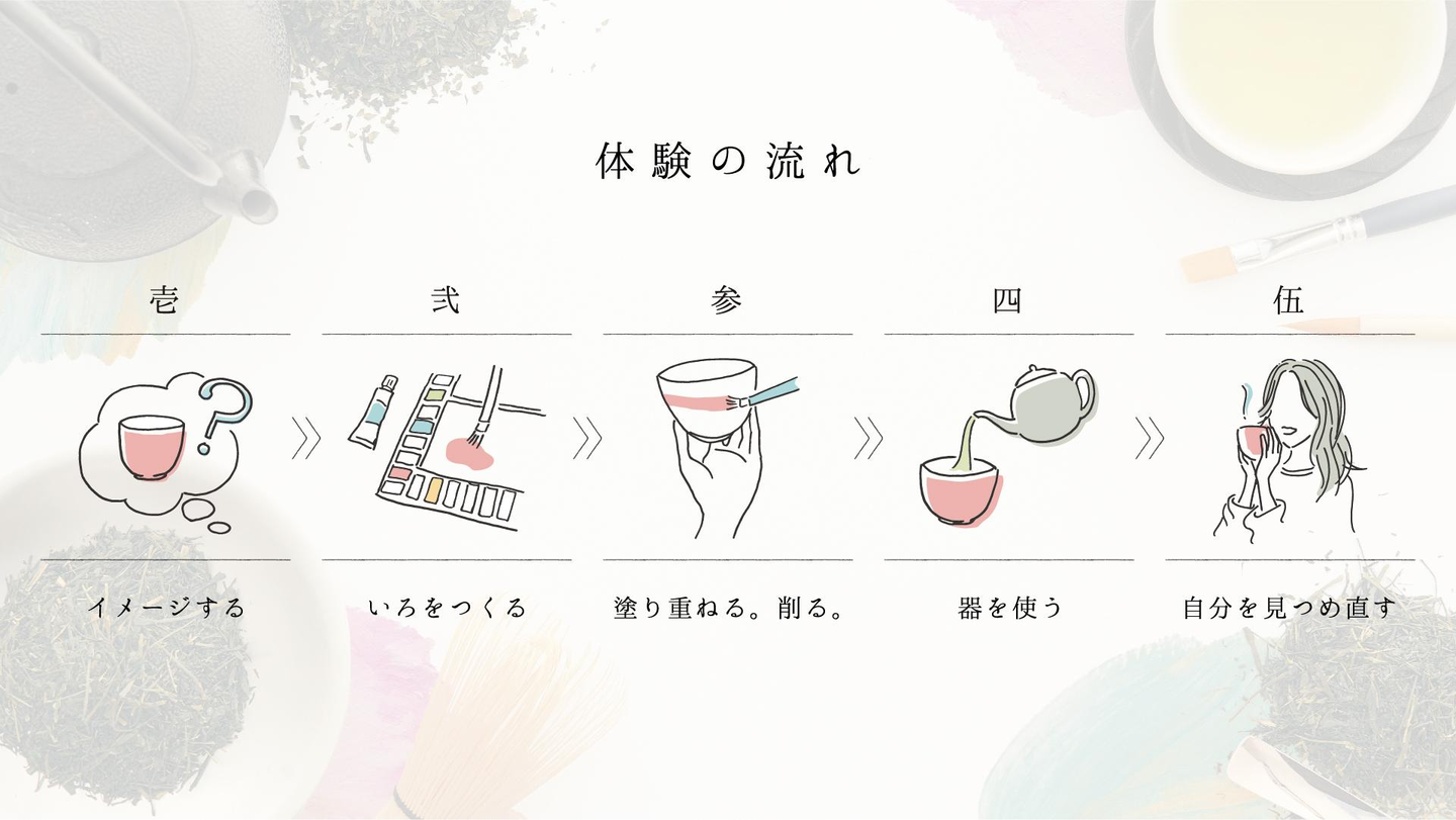 自分で色彩をほどこしたオリジナル器で楽しむ一杯は「shu ha ri」というプレミアム日本茶です。明治時代より続くお茶問屋の多田製茶監修によるスペシャルブレンド。