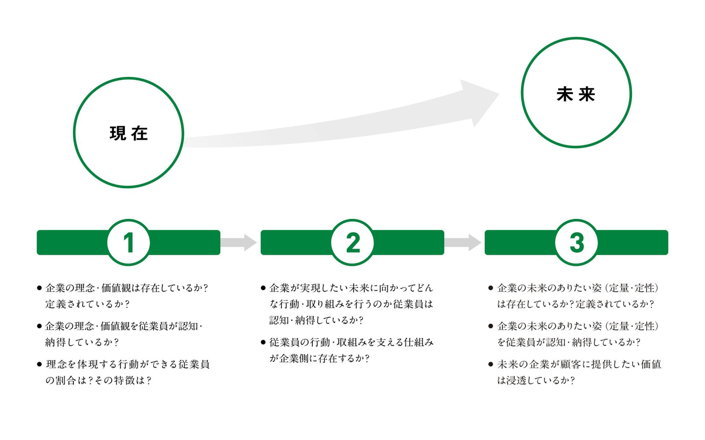 もし現在、企業の理念・価値観が存在していない場合は、前述のとおり CI(コーポレート・アイデンティティ)の策定から取り組むことが重要課題になります。あるいは、CIは確立できているが、それを体現する従業員の割合が少ない、という場合は、企業活動においてどのプロセスにおいてそれが顕著にあらわれているかを分析する必要があるでしょう。