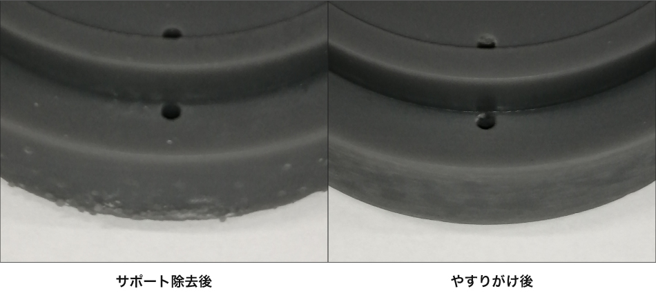 今回のモデルにはサポート(=造形時に空中に浮いている部分やモデルを支えるもの)を付けて造形していたので、多少の痕がありました。