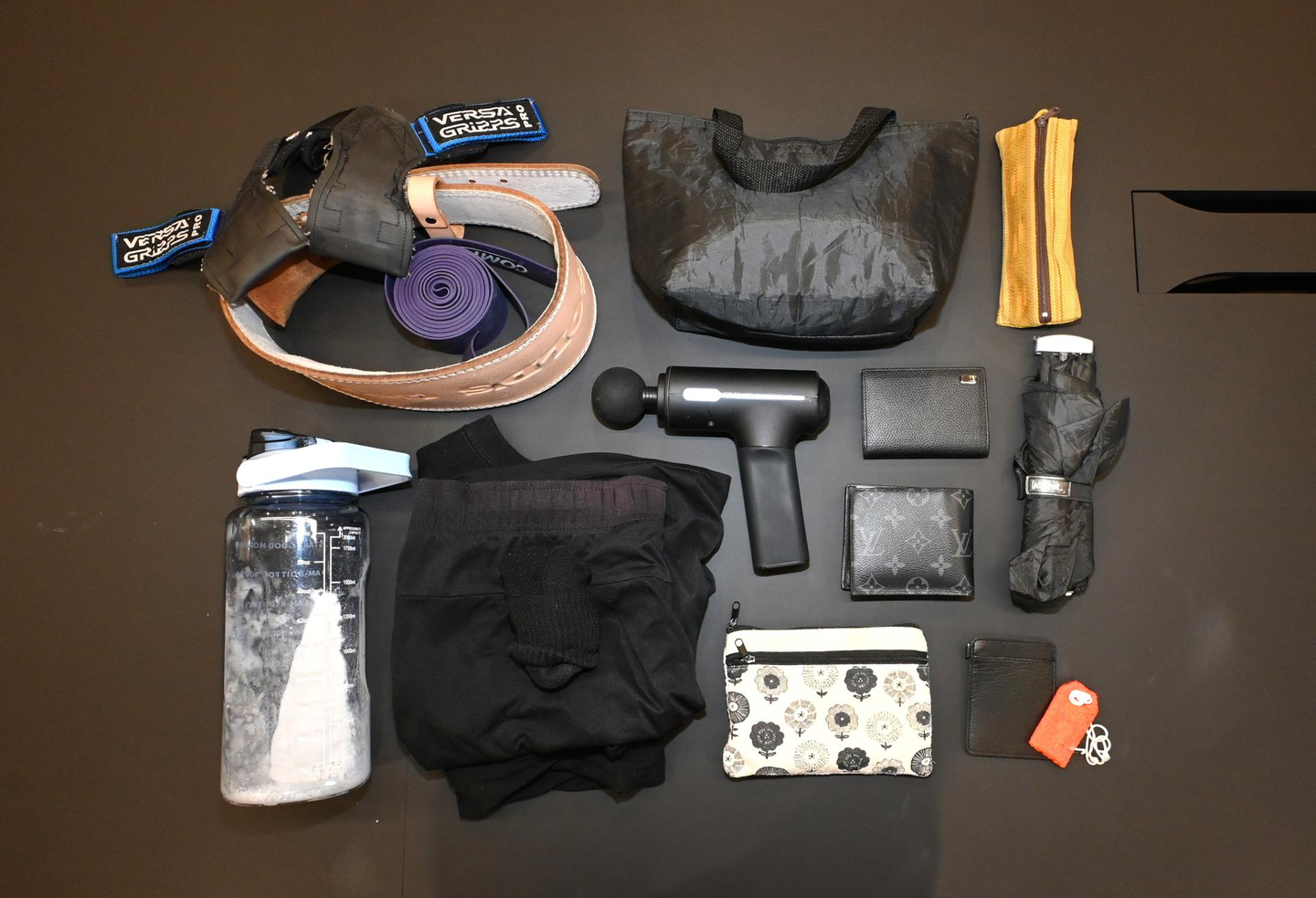 この日もジムに行くので、持ち物は2Lドリンクボトル/着替え/トレーニングギア/お弁当/マッサージガン/小物入れ/パスケース/お守り/財布/名刺入れ/折り畳み傘/ペンケース。