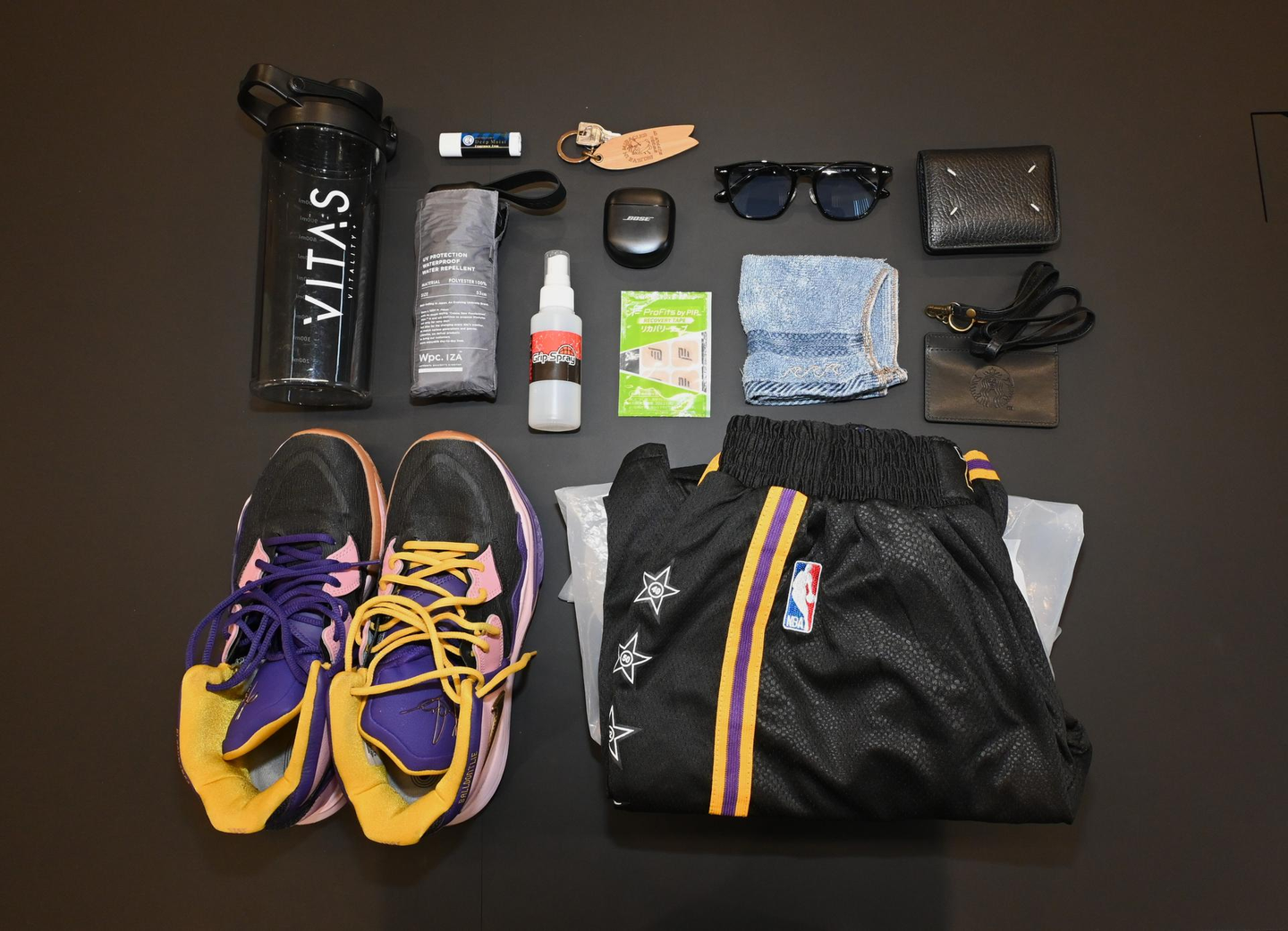 この日は退勤後にバスケをするようで、バッグの中身はバスケットシューズ/着替え/バイタスシェイカー/滑り止め(バスケ用)/リカバリーテープ/折り畳み傘/リップ/鍵/財布/パスケース/メガネ/ハンカチ/AirPods。