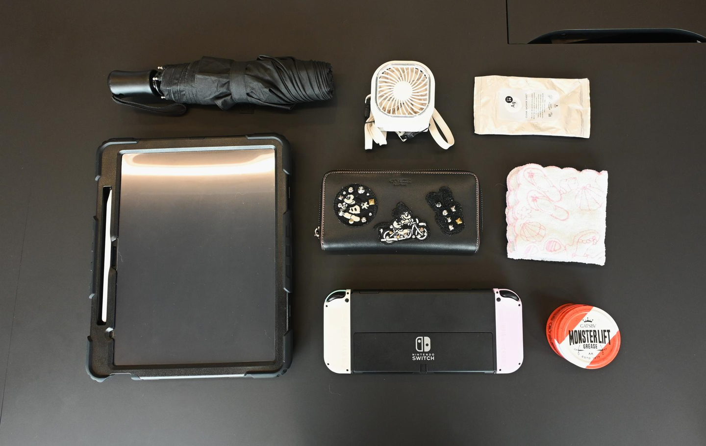 バッグの中身は、折り畳み傘/iPad/Nintendo Switch/財布/ヘアワックス/ハンカチ/首かけファン/汗拭きシート。