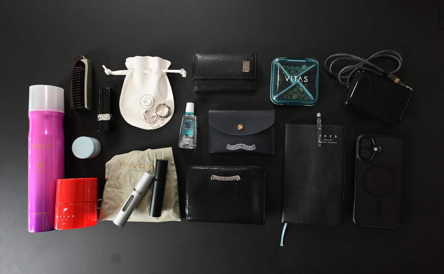 統一感を出すため、基本的に小物は黒で統一しているそう。髪にこだわりが強く、ヘアスプレーは絶対に持ち歩いています💁♂️「梅雨の時期は不愉快」と言っていました。