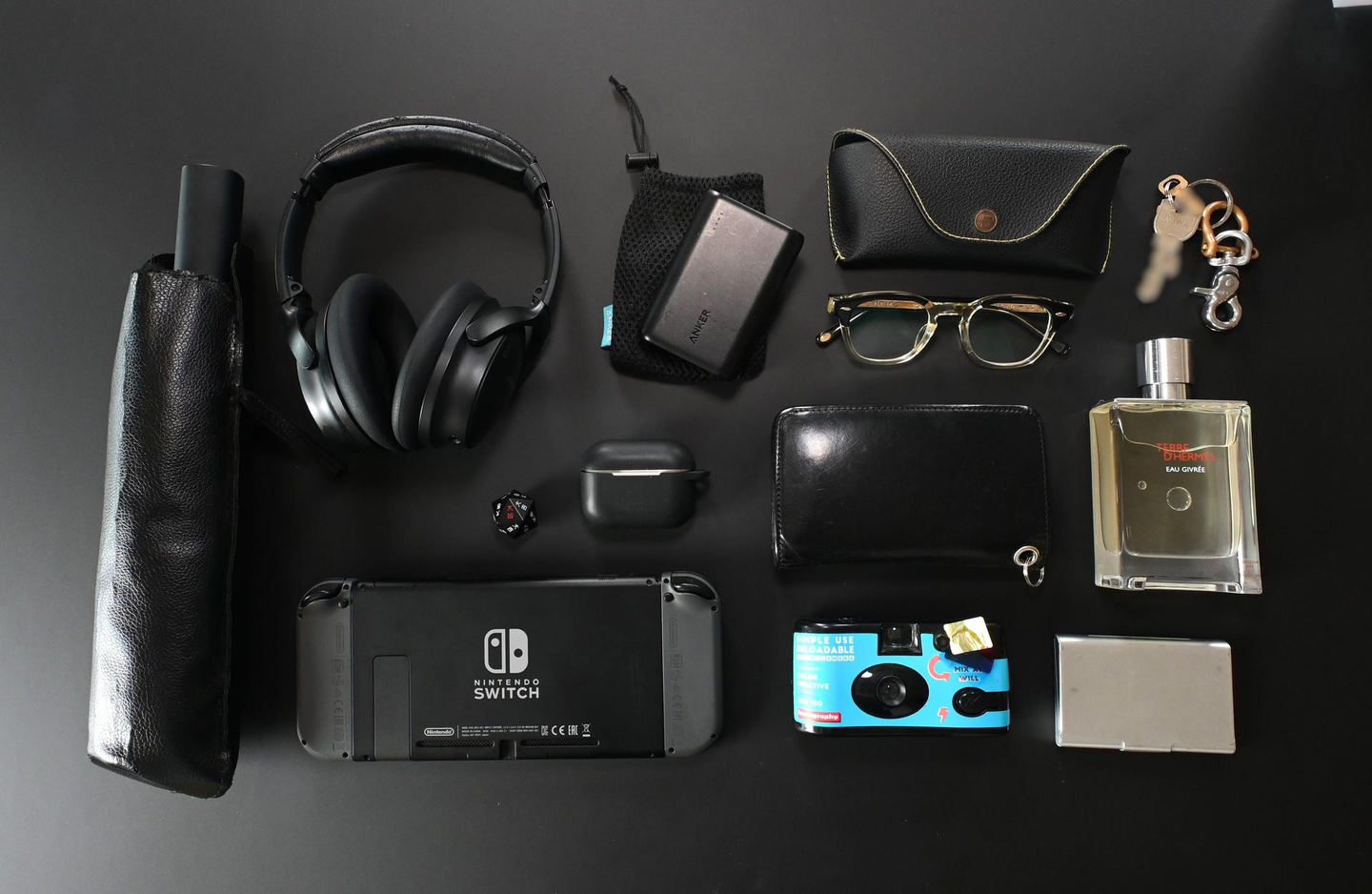 鍵/メガネ/香水/財布/名刺入れ/フィルムカメラ/Nintendo Switch/AirPods/モバイルバッテリー/ヘッドホン/折り畳み傘/リスキーダイス(HUNTER×HUNTER)。