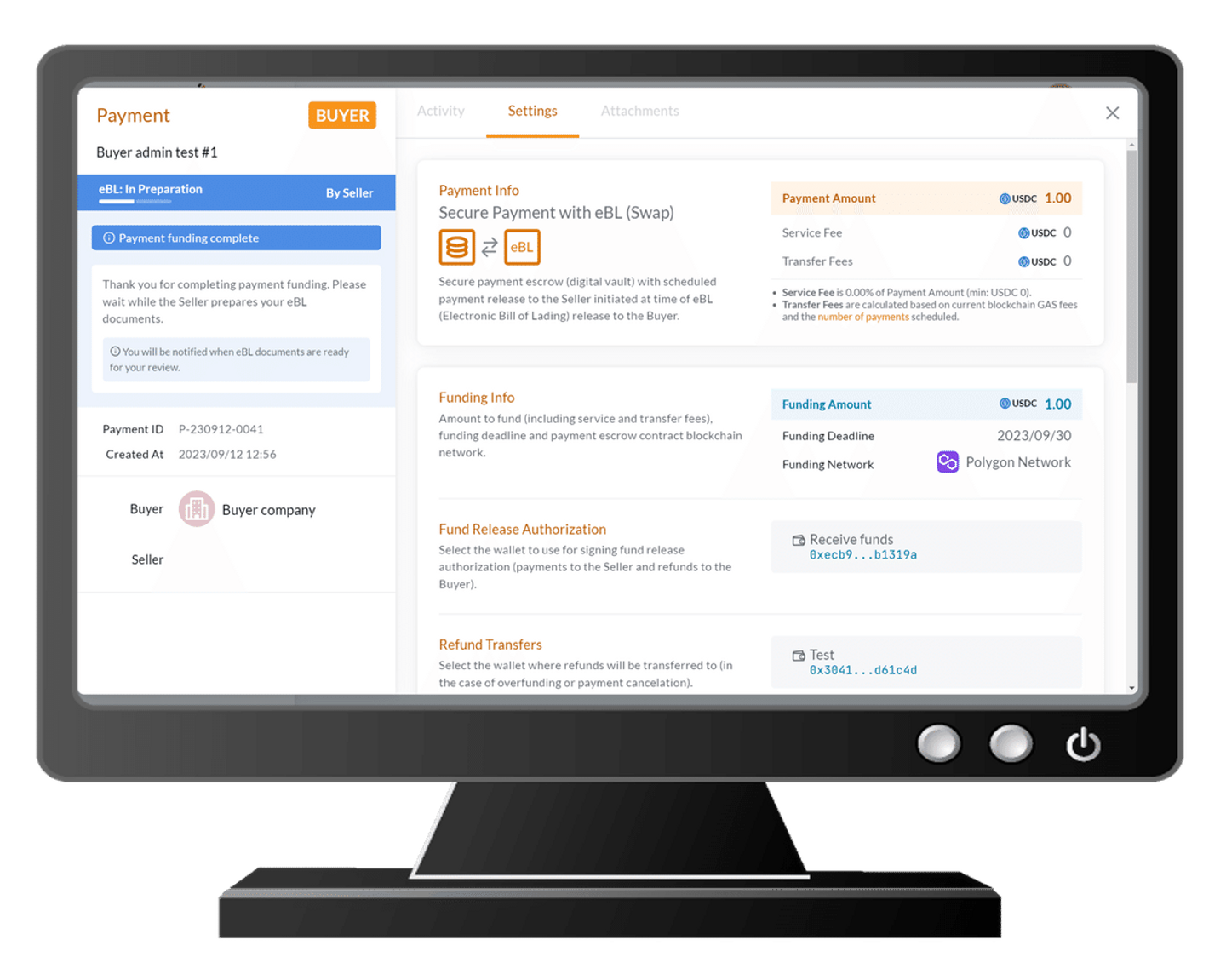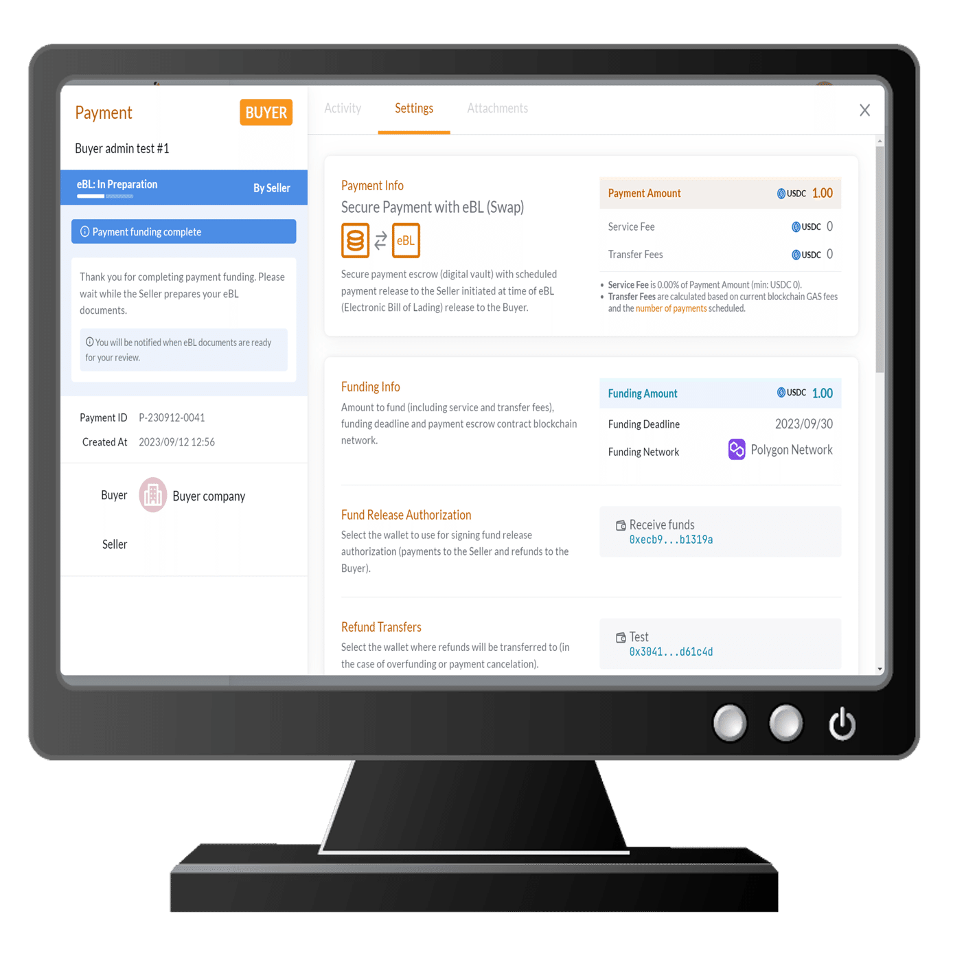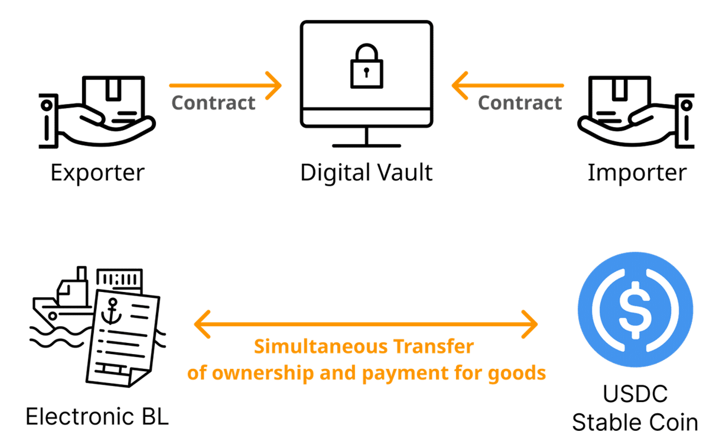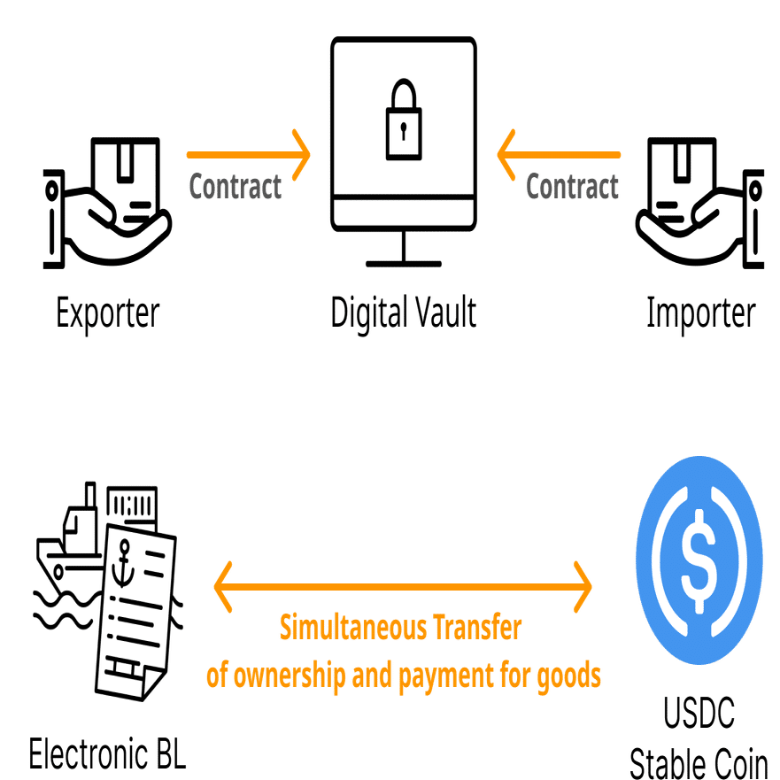 「商品」の所有権としてはNFT化した「電子船荷証券(eBL)」を使い、ブロックチェーン上の「デジタル金庫」に、売り手・買い手からそれぞれを格納します。